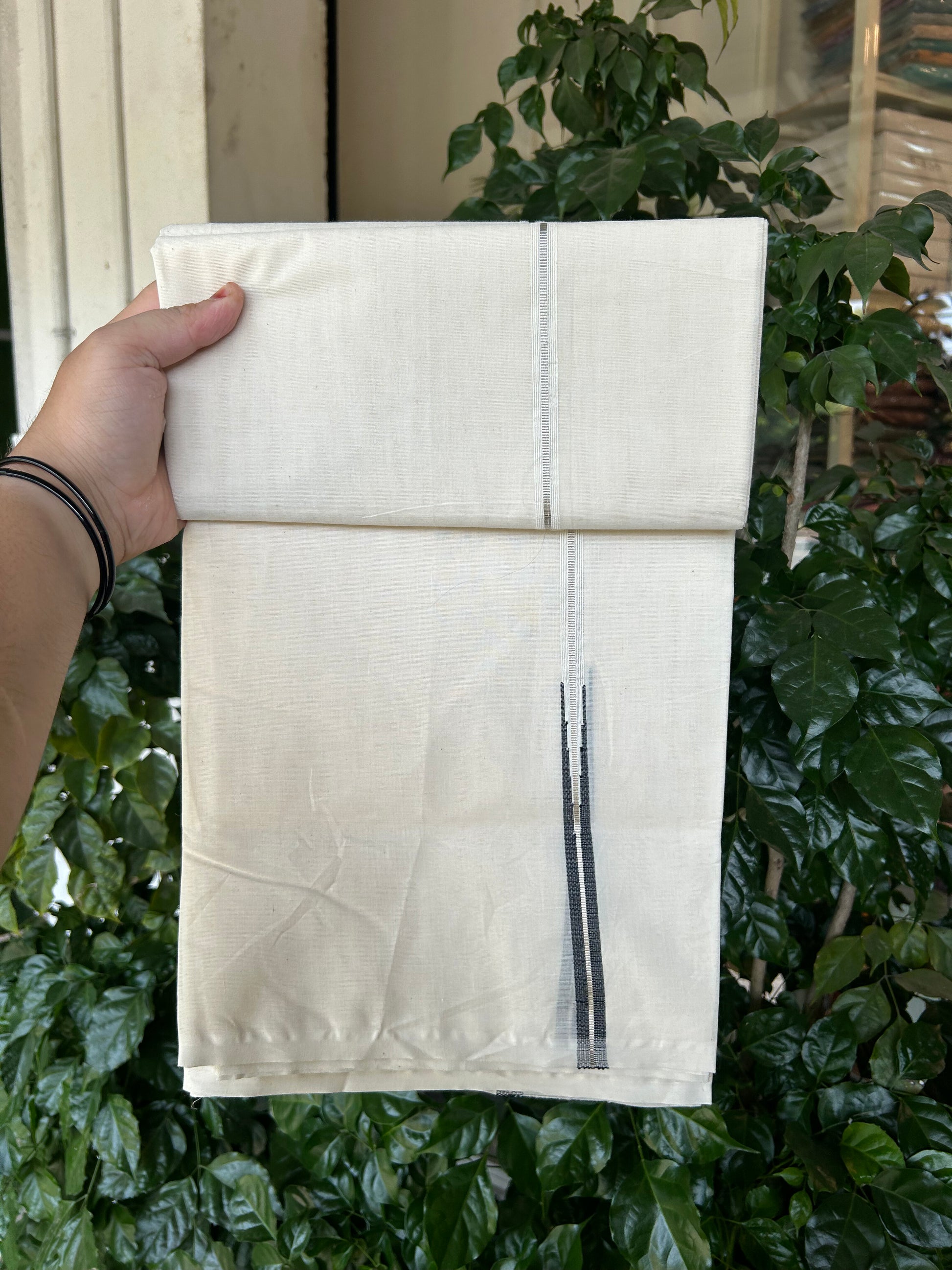 20% Discount! KaithariKada Balaramapuram 100% Cotton Double Off white Mundu/Dhoti- 100x100 - 1 cm Puliyilakkara Silver Kasav & Black Chutty Kara - 4 mtr (8.5 muzham) - 7 KK5373 ASH