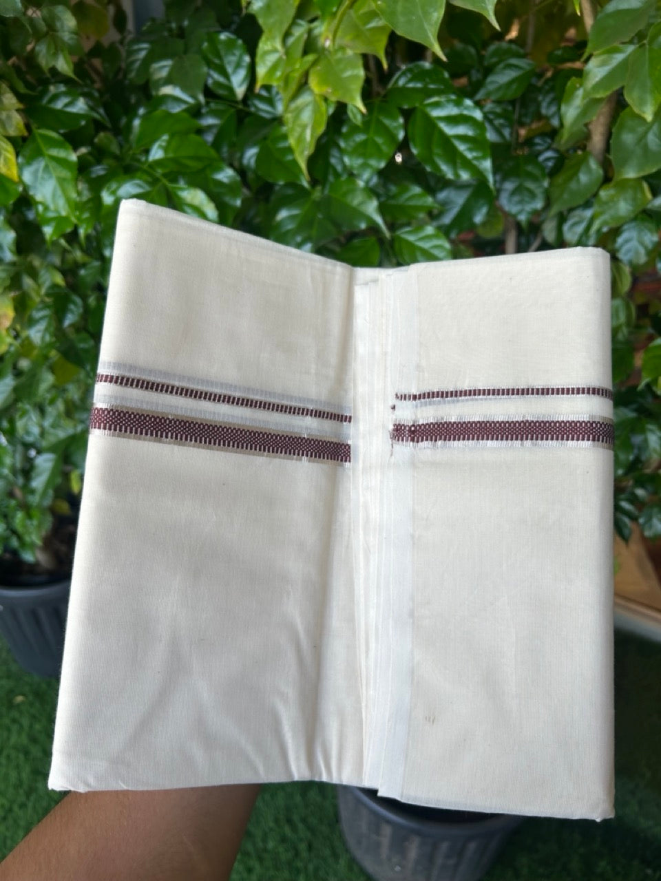 20% Discount KaithariKada Balaramapuram 100% Cotton Double Off white - (Unbleached) - Mundu/Dhoti - 100x100 - 1.5 cm Silver Kasav & Brown Design Kara - 12KK5226 ASH
