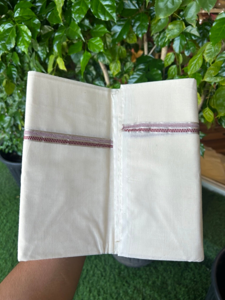 20% Discount KaithariKada Balaramapuram 100% Cotton Double Off white - (Unbleached) - Mundu/Dhoti - 100x100 - 0.5 inch Silver Kasav & Maroon Design Kara - 14KK5226 ASH