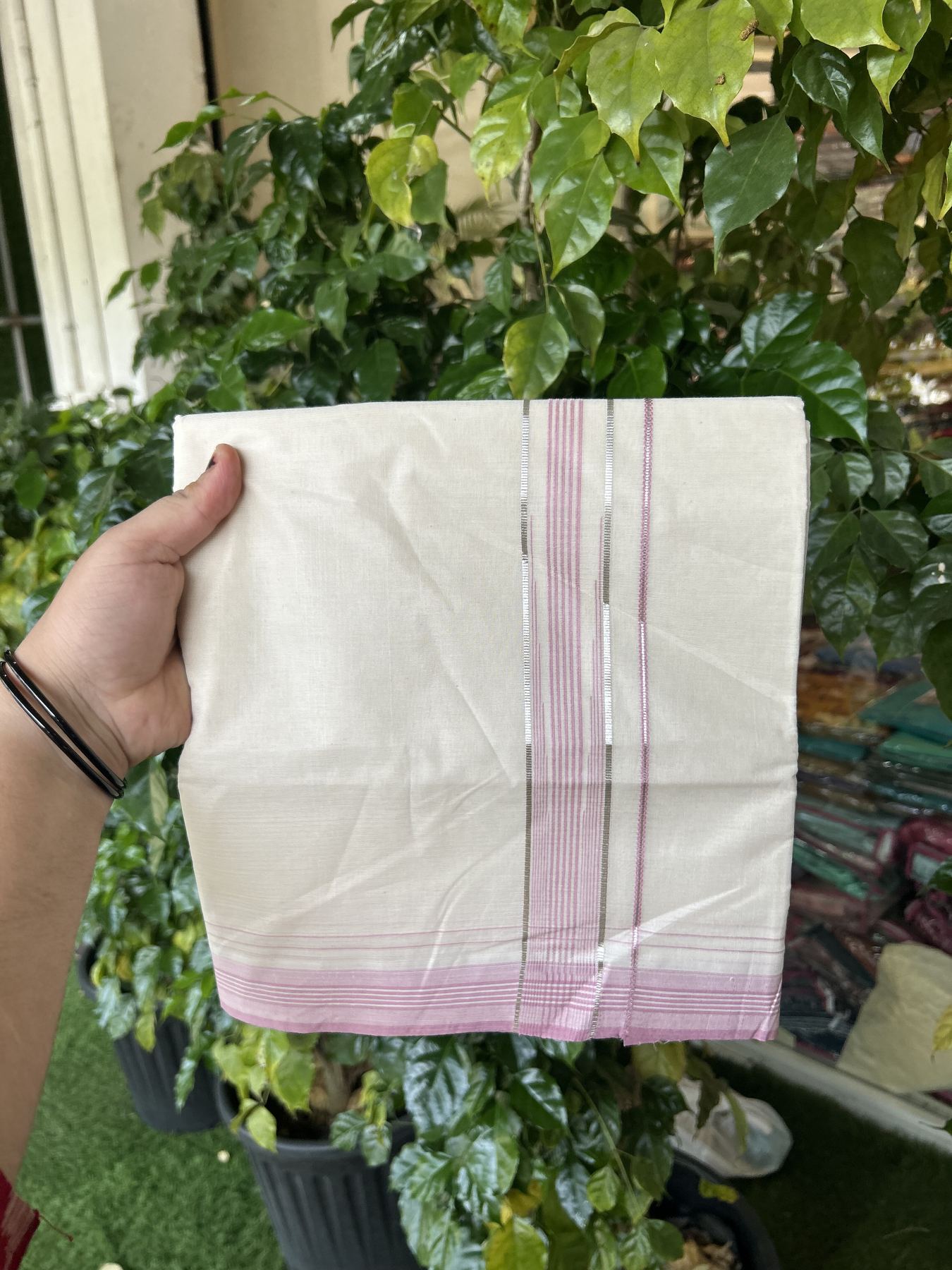 20% Discount ! KaithariKada Balaramapuram 100% Cotton Double Off White - (Unbleached) - Mundu / Dhoti- 100x80 - 1.25 inch Puliyilakkara Silver Kasav & Pink shaded striped chutty Kara - 4 mtr (8.5 Muzham) - 37 KK5340 VIN