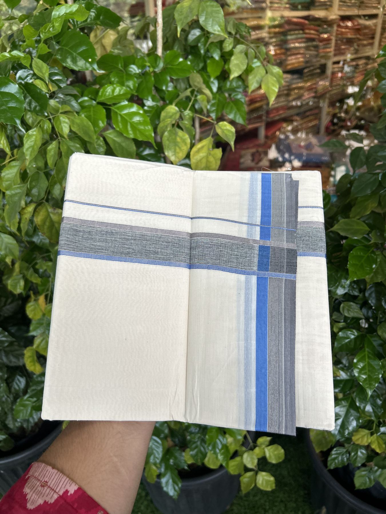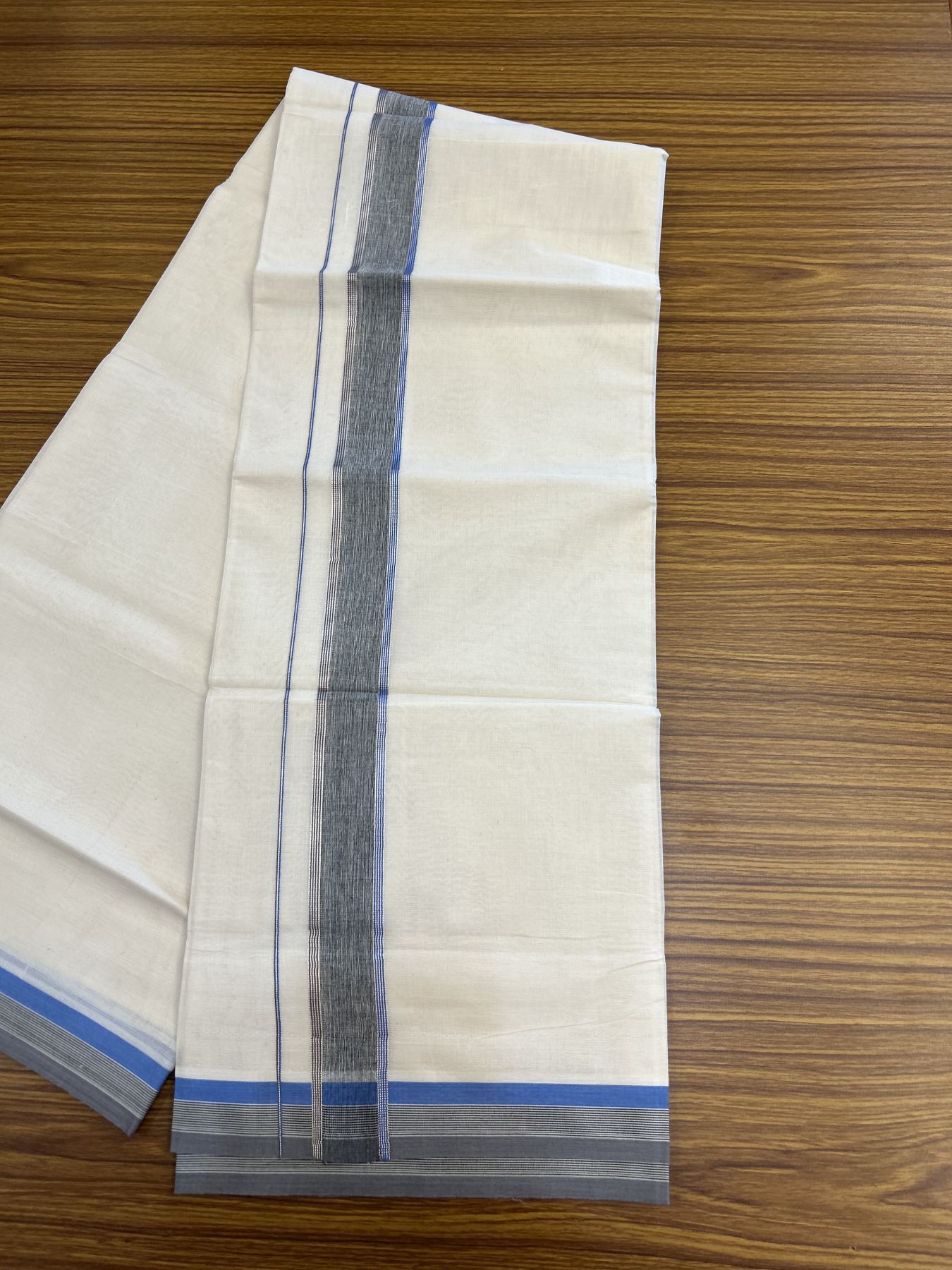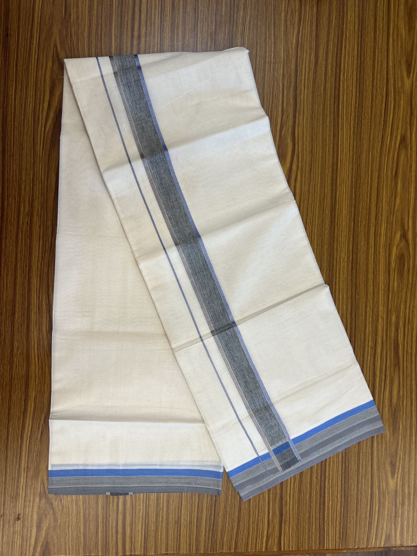 20% Discount ! KaithariKada Balaramapuram 100% Cotton Double Off White - (Unbleached) - Mundu / Dhoti- 100x80 - 1.5 inch Silver Kasav Black Ash & Blue shaded Kara - 4 mtr (8.5 Muzham) - 41 KK5340 VIN