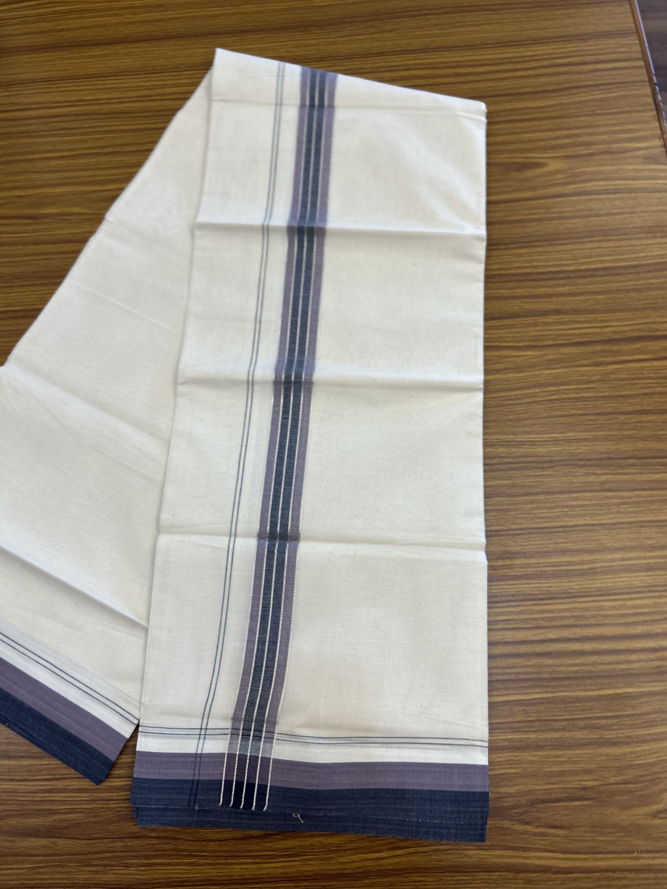 20% Discount ! KaithariKada Balaramapuram 100% Cotton Double Off White - (Unbleached) - Mundu / Dhoti- 100x80 - 1.5 inch Silver Kasav Navy Blue & Purple Ash shaded Stripes Kara 4 mtr (8.5 Muzham) - 44 KK5340 VIN
