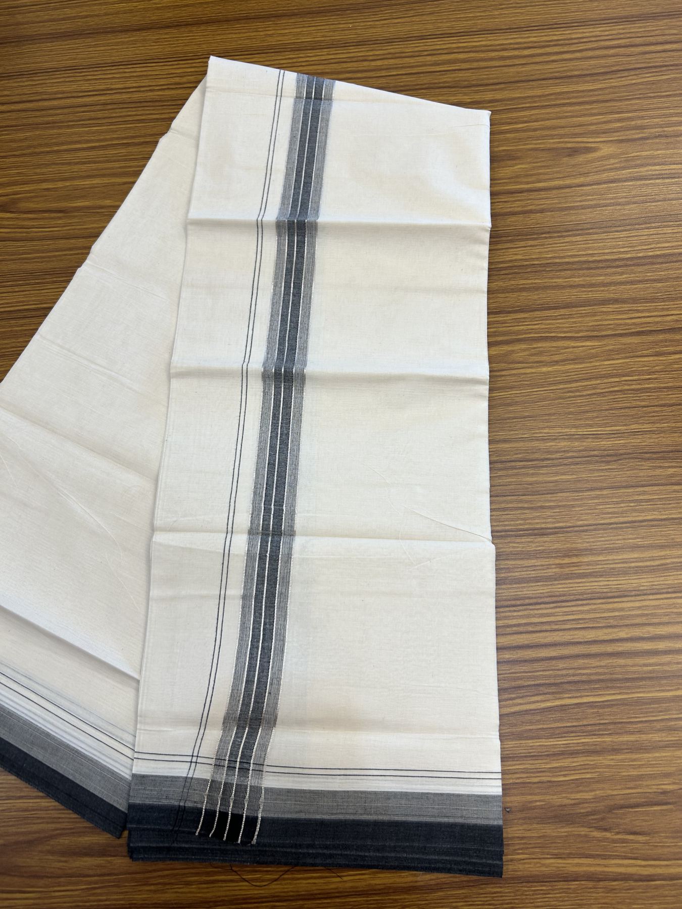 20% Discount ! KaithariKada Balaramapuram 100% Cotton Double Off White - (Unbleached) - Mundu / Dhoti- 100x80 - 1.5 inch Silver Kasav Black & Ash shaded Stripes Kara 4 mtr (8.5 Muzham) - 48 KK5340 VIN