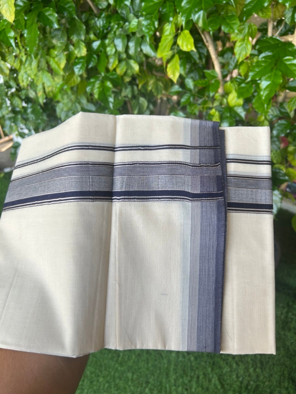 20% DISCOUNT! KaithariKada Balaramapuram 100% Cotton Double OFF WHITE (unbleached) Mundu/Dhoti- 100x80- 1.75 inch Silver Kasavu & Navu Blue Stripes Shaded Kara 4 mtr (8.5 muzham) - 89KK5227 PMC