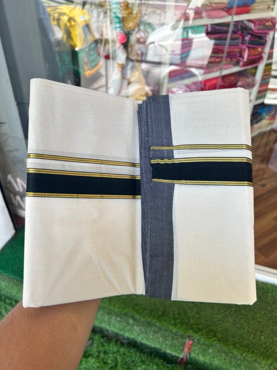 20%Discount KaithariKada Balaramapuram 100% Cotton Double Off white - (Unbleached) - Mundu/Dhoti-100x80 - 1 inch Black & Gold Kasavu Striped Kara 3.75 mtr (8 Muzham)- 5KK5198ASH