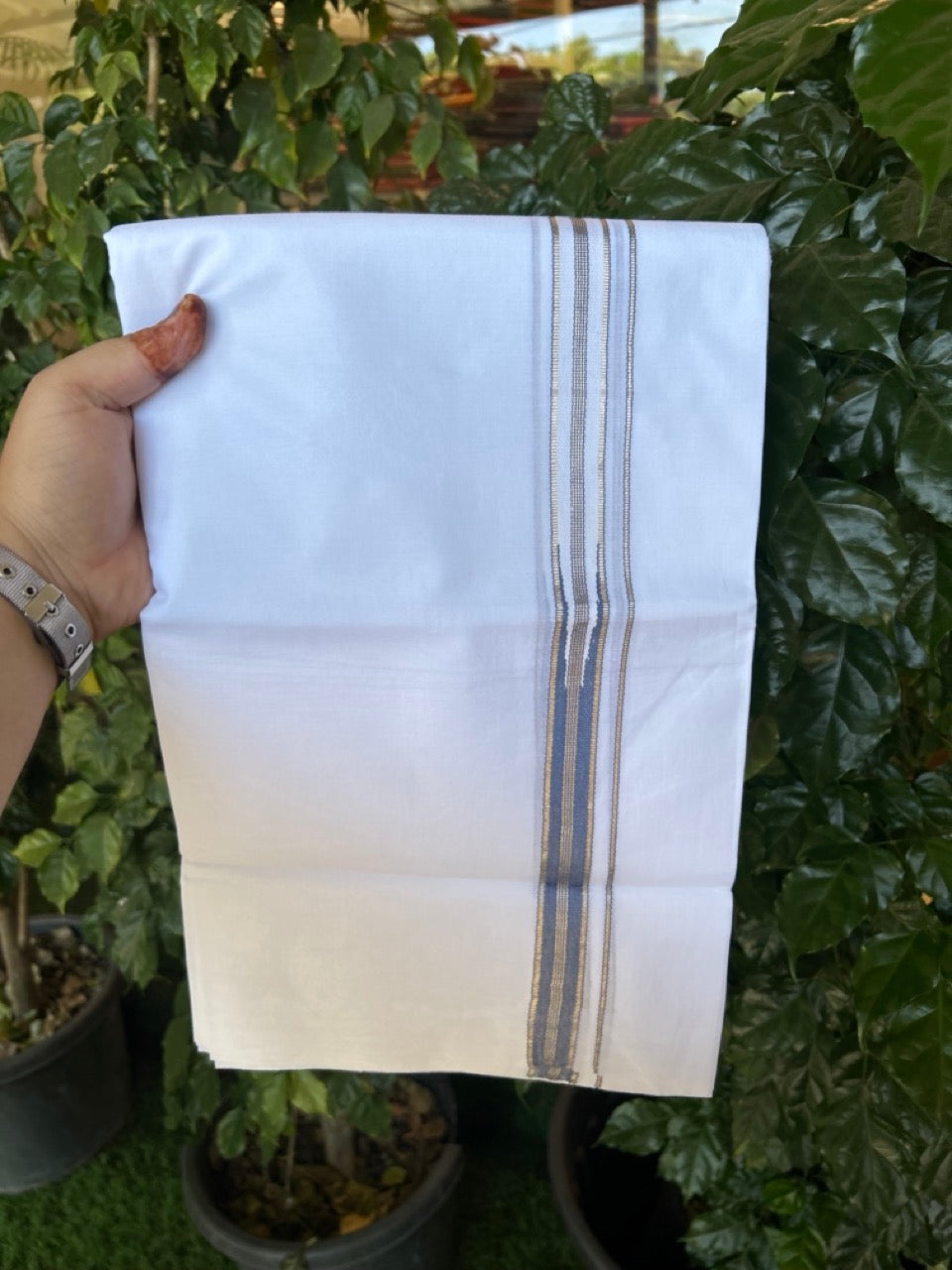 20% Discount! KaithariKada Balaramapuram 100% Cotton Double Pure white Mundu/Dhoti- 100x100 - 0.75 inch Silver & Ash Blue Striped One Side Chutty kara - 3.90mtr ( 8 muzham) - 66 KK5279 CKS