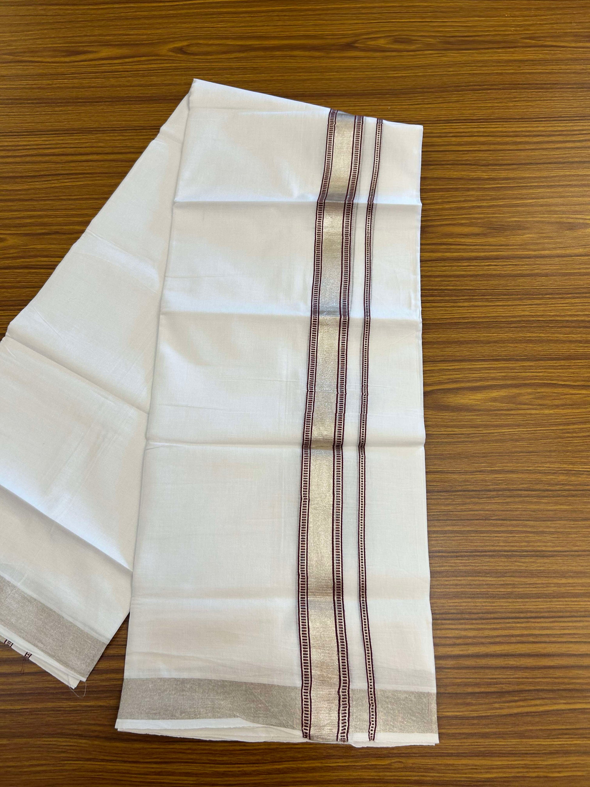 20% Discount!! KaithariKada Balaramapuram 100% Cotton Double Pure White Mundu/Dhoti - 100x100 - 1.5 inch Silver Kasav & Maroon Design Kara 3.90 mtr (8 muzham) - 1 KK5309 GAN