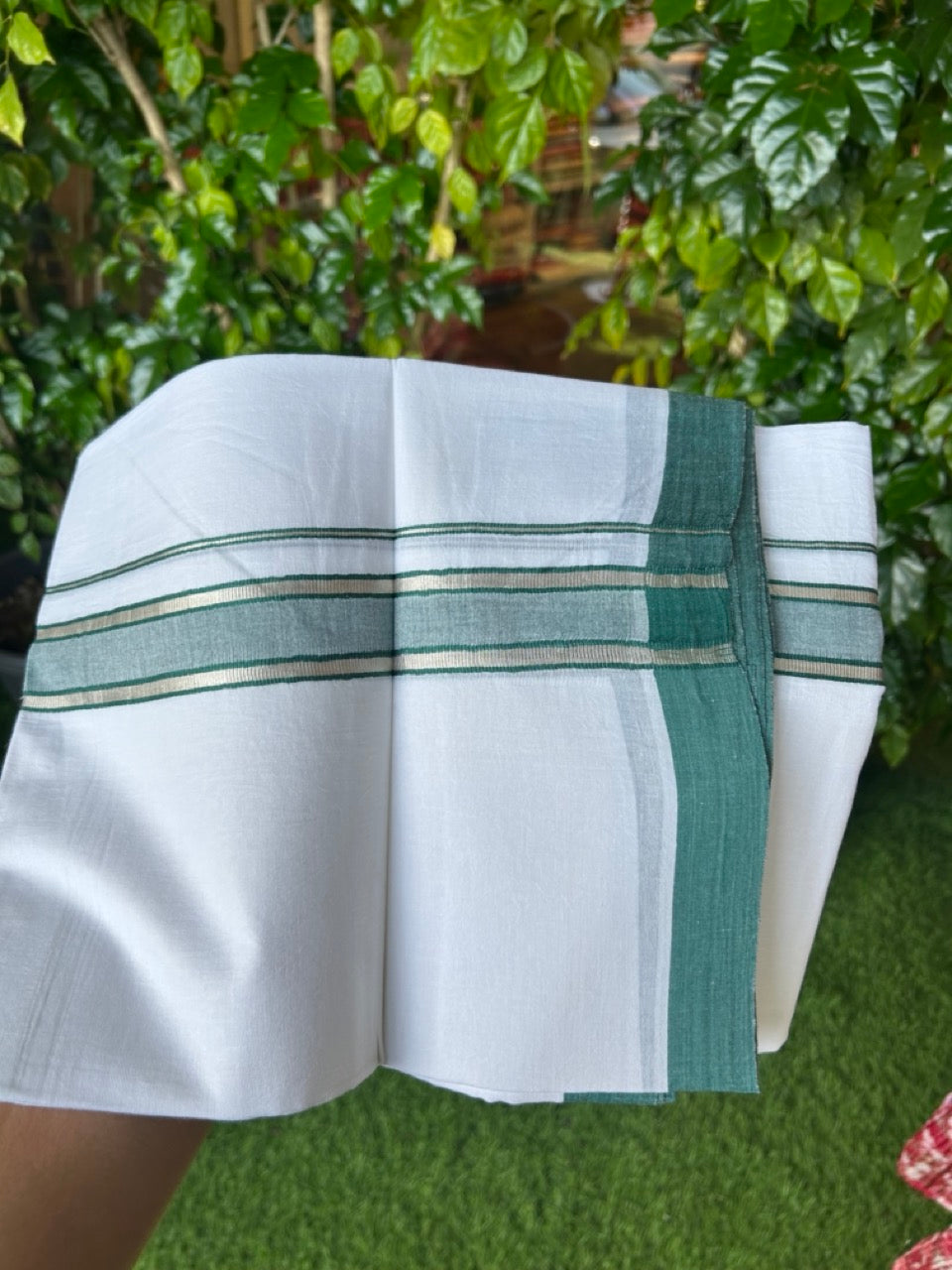 20% DISCOUNT! KaithariKada Balaramapuram 100% Cotton Double Pure white Mundu/Dhoti- 60s - 1.5 inch Silver Kasavu & Green Shaded Kara - 3.86mtr ( 8 muzham) - 22KK5227 PMC