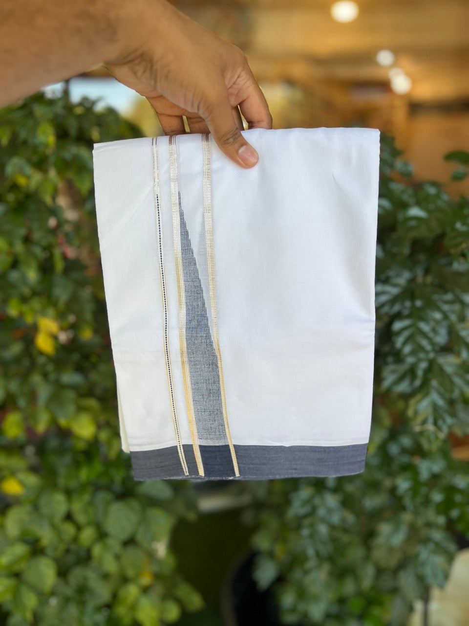 20% Discount! KaithariKada Balaramapuram 100% Cotton Double Pure white Mundu/Dhoti- 100x80 - 1.5 inch Silver & Navy Blue Chutty kara - 3.90mtr ( 8 muzham) - 77 KK5279 CKS