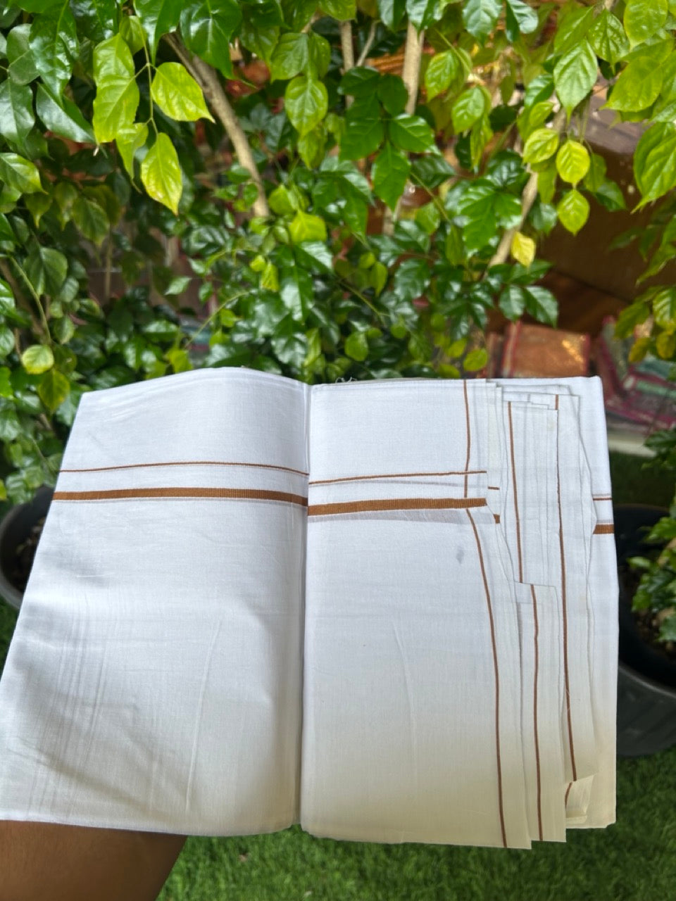 23% DISCOUNT! KaithariKada Balaramapuram 100% Cotton Double Pure white Mundu/Dhoti-( 60s ) - 0.25 inch Brown Thin Kara - 3.88 mtr ( 8 muzham)- 2KK5227 PMC