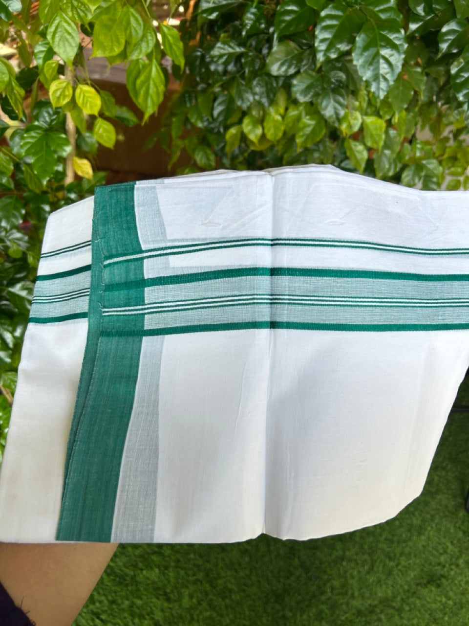 20% DISCOUNT! KaithariKada Balaramapuram 100% Cotton Double Pure white Mundu/Dhoti-( 60s ) - 1.5 inch Green Shaded Striped Kara - 3.84mtr ( 8 muzham) - 15KK5227 PMC