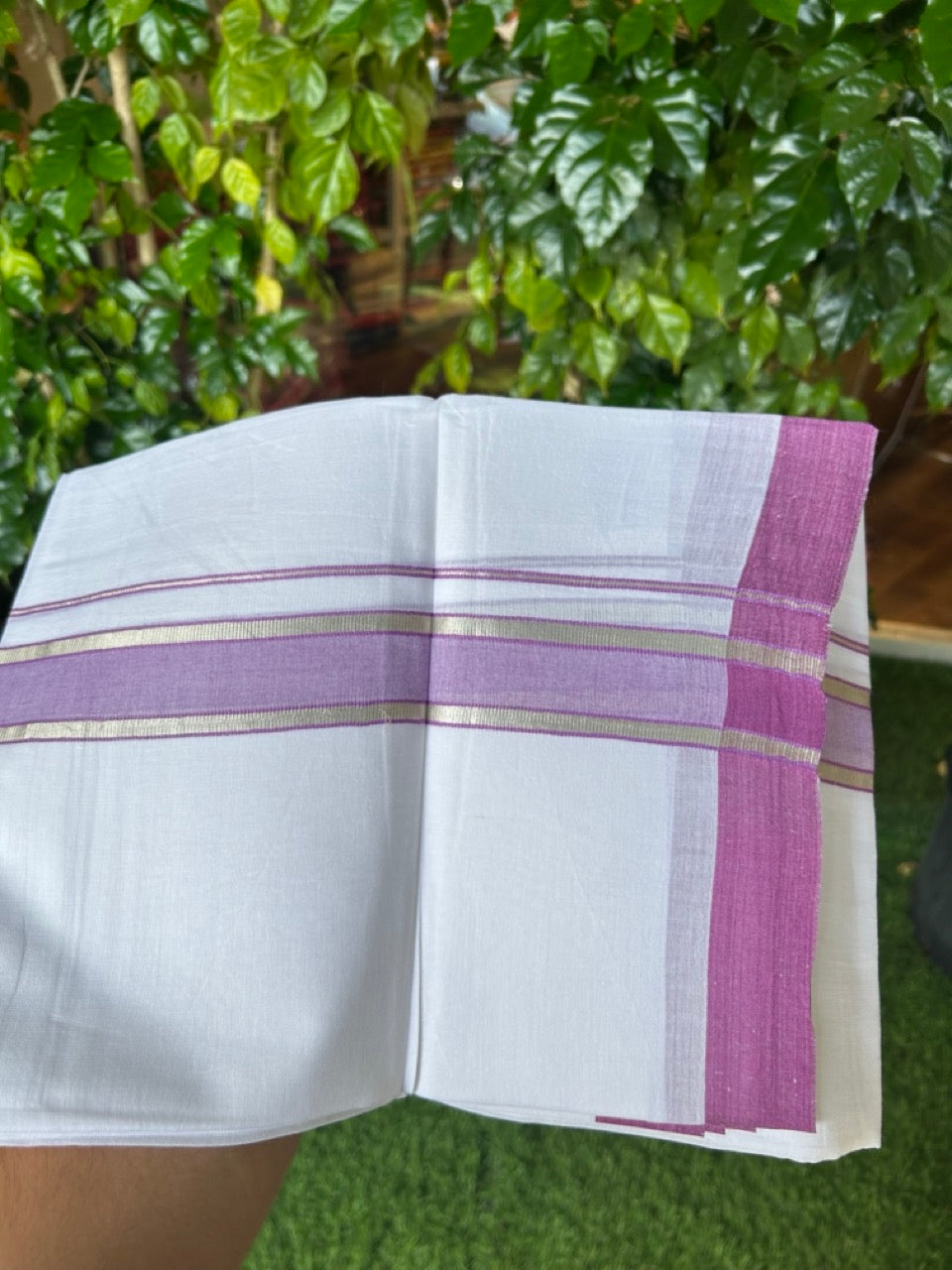 20% DISCOUNT! KaithariKada Balaramapuram 100% Cotton Double Pure white Mundu/Dhoti- 60s - 1.5 inch Silver Kasavu & Dusty Violet Shaded Kara - 3.86mtr ( 8 muzham) - 25KK5227 PMC