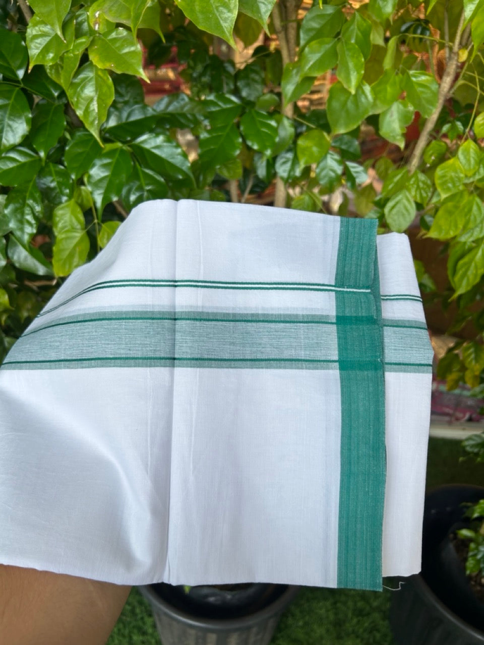 32% DISCOUNT! KaithariKada Balaramapuram 100% Cotton Double Pure white Mundu/Dhoti-( 60s ) - 1.5 inch Green Shaded Kara - 3.86mtr ( 8 muzham) - 10KK5227 PMC