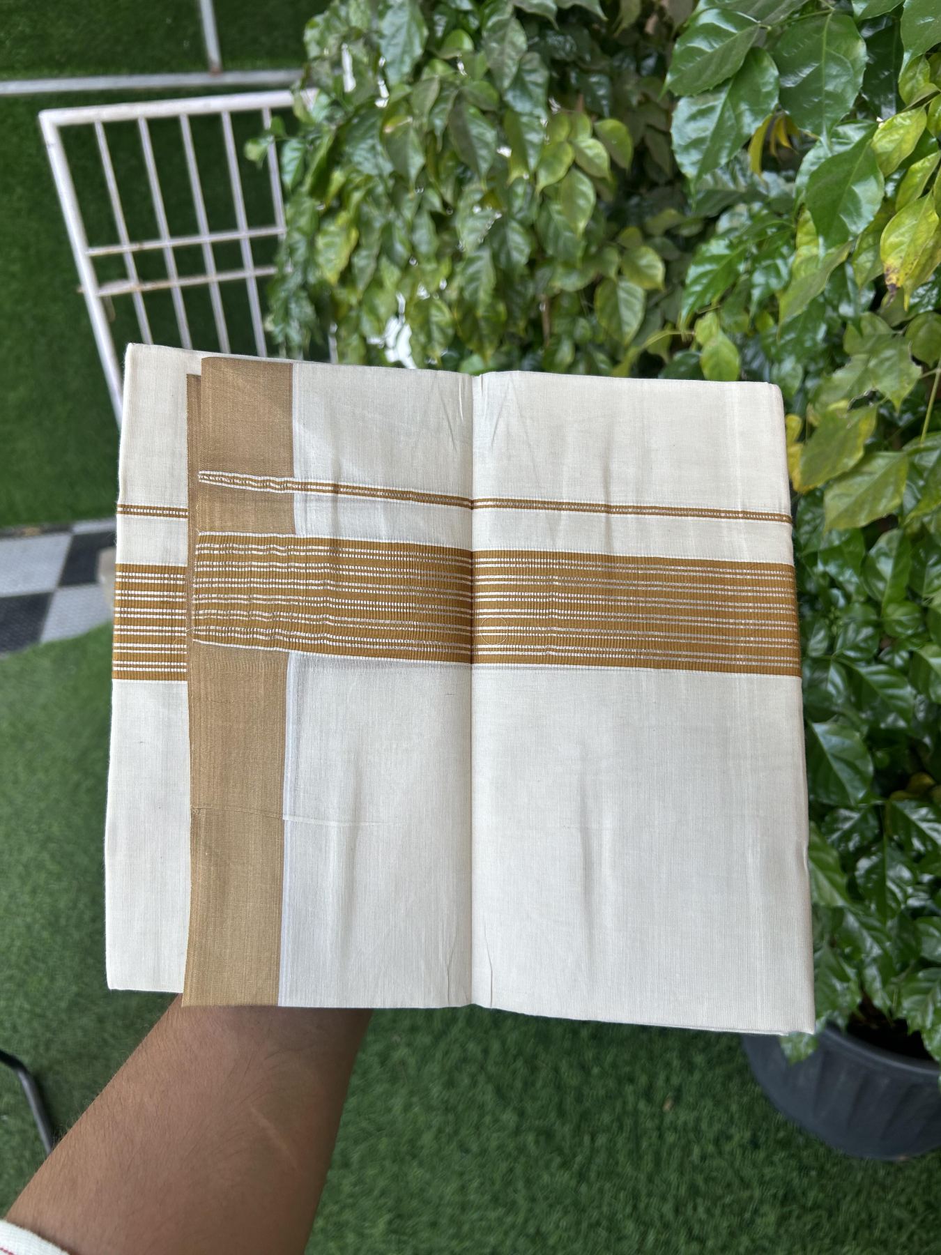 20% Discount! KaithariKada Balaramapuram 100% Cotton Off white Double Mundu/Dhoti - 80s - 1.75 inch Silver Kasav & Dark Mustard Striped Kara - 4mtr (8.5muzham) - 19 KK5357 VAS