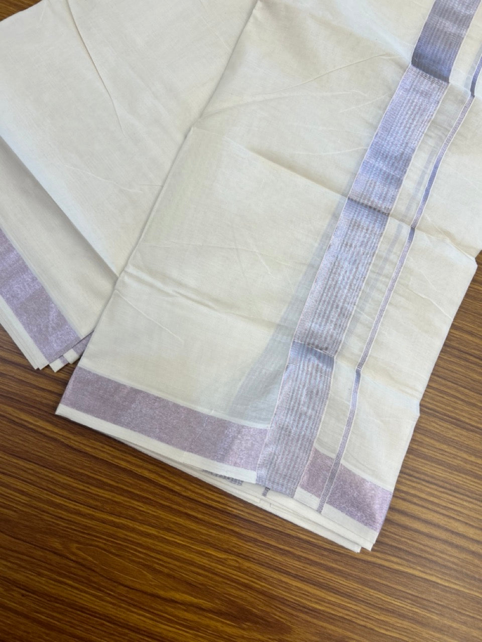 20% Discount ! Kaitharikada Balaramapuram 100% Cotton Off White Double Mundu/Dothi - 100x80- 1.5 Inch Silver Kasav & Rose Pink Kasav Striped Kara - 4mtr (8.5muzham)- 4 KK5279 CKS