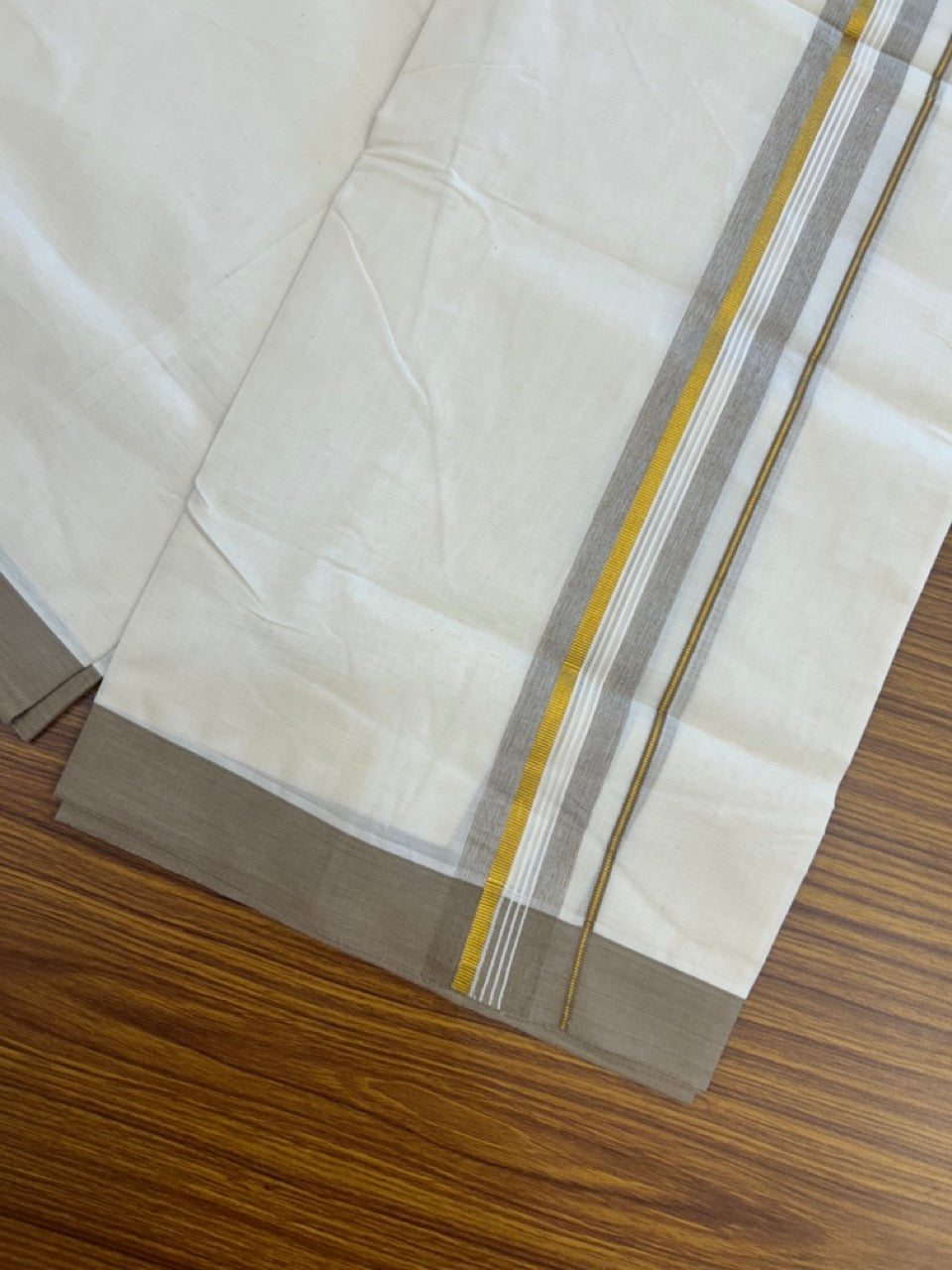 20% Discount ! KaithariKada Balaramapuram 100% Cotton Off White (Unbleached) Double Mundu/Dhoti - 80s - 1.5 inch Gold Kasav & Peanut Brown Shaded Striped kara 4 mtr (8.5 muzham) - 33 KK5302 MUT
