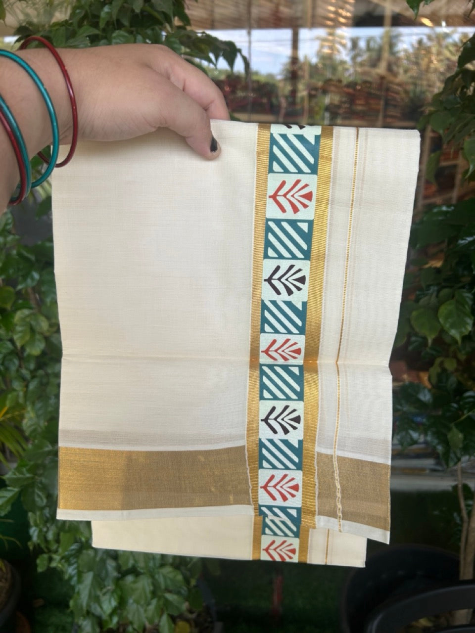 20% Discount! KaithariKada Balaramapuram 100% Cotton off white - (Unbleached) Double Mundu/Dhoti - 80X72 Cotton mix - 2 inch Printed Multicolour & Gold kasav kara - 2KK5172PMC
