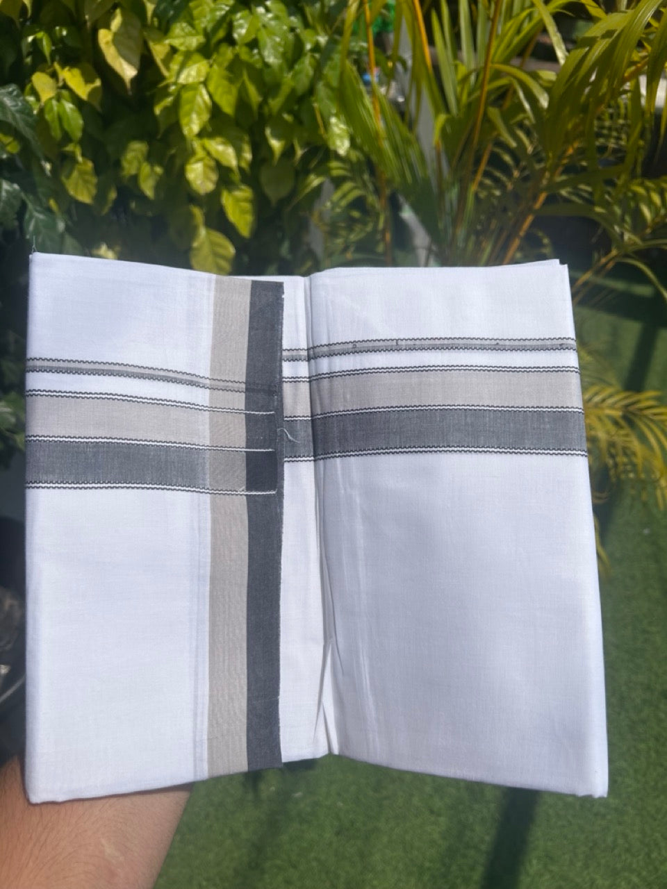 28% DISCOUNT! KaithariKada Balaramapuram 100% Cotton PURE WHITE Double Mundu/Dhoti - 100x80 - 1.75 inch Light Grey & Black shaded designer kara - 10KK5134THI