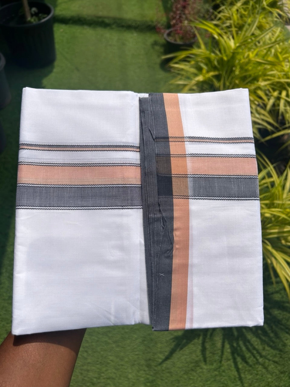 28% DISCOUNT! KaithariKada Balaramapuram 100% Cotton PURE WHITE Double Mundu/Dhoti-100x80 2.75 inch Peach cream & Black shaded designer kara - 17KK5116MR