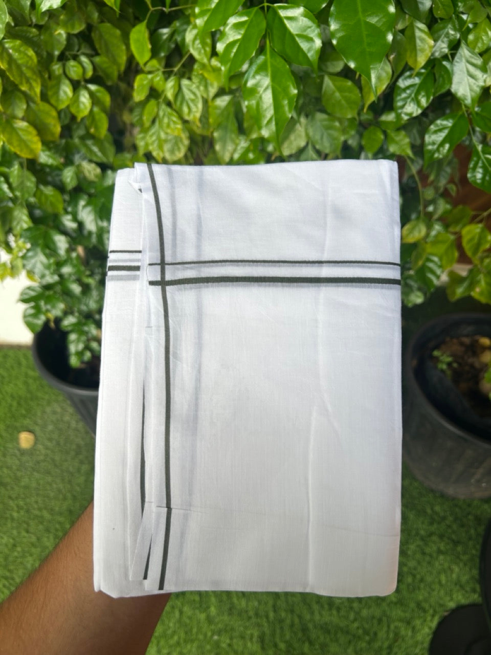 20% Discount ! Kaitharikada Balaramapuram 100% Cotton PURE WHITE Double Mundu/Dothi - 100x100 - 0.5 cm Dark Olive Green thin Kara - 55KK5217 CKS