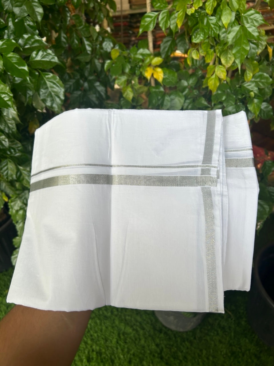 20% Discount ! Kaitharikada Balaramapuram 100% Cotton Pure White Double Mundu/Dothi - 100x80 - 1 cm Silver Kasav Kara 4 mtr (8.5 muzham) - 36 KK5255 VAS