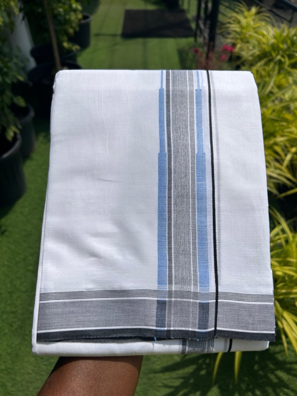 20% DISCOUNT!! Kaitharikada Balaramapuram 100% Cotton PURE WHITE Double Mundu/Dothi- 80X90 -1.75 Inch Light Blue & Black Striped Chutty Kara 3.70m (8 Muzham) - 50KK5115THI