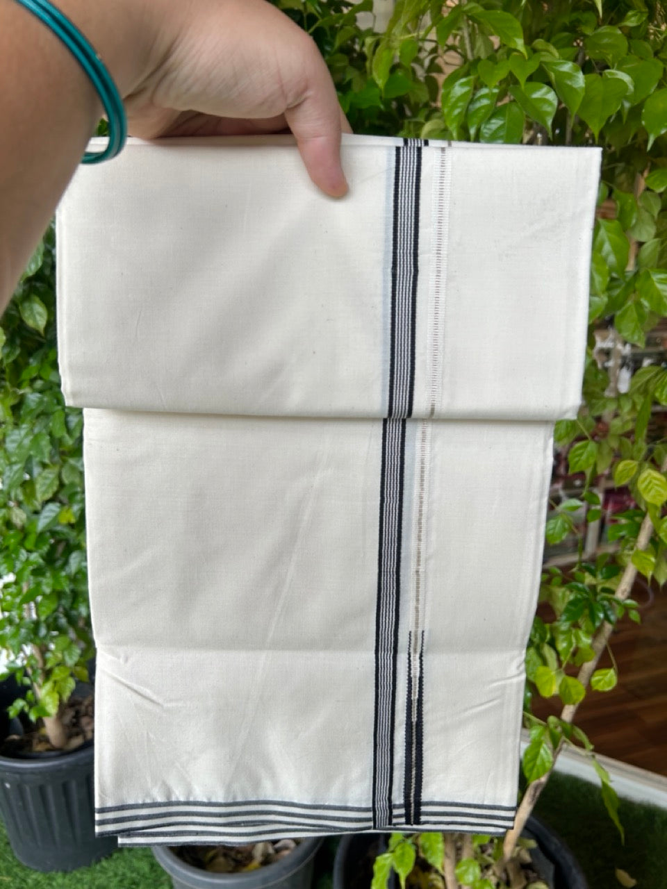 20% DISCOUNT ! KaithariKada Balaramapuram 100% COTTON SINGLE OFF WHITE (Unbleached) Mundu/Dhoti-Twisted 100s Thread- 0.5inch Puliyilakkara Silver Kasavu & Black Striped Chutty Kara (2 meter / 4 muzham)- 18KK5203ASH