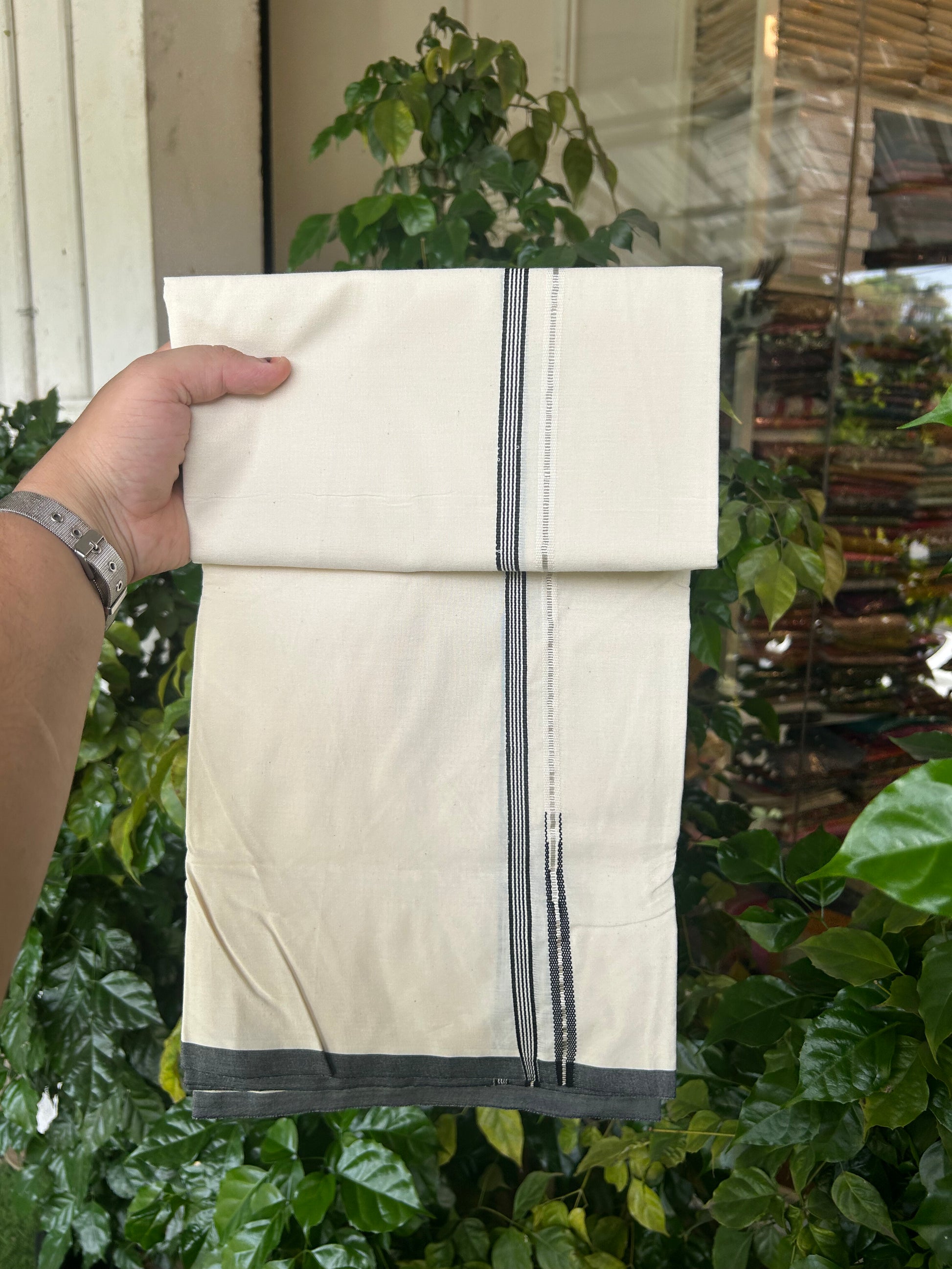 20% Discount!! KaithariKada Balaramapuram 100% Cotton Single Off white (Unbleached) Mundu/Dhoti- Twisted 100s Thread - 1 cm Puliyilakkara Silver Kasav & Black Striped Chutty Kara (2 meter / 4 muzham) - 4 KK5346 ASH