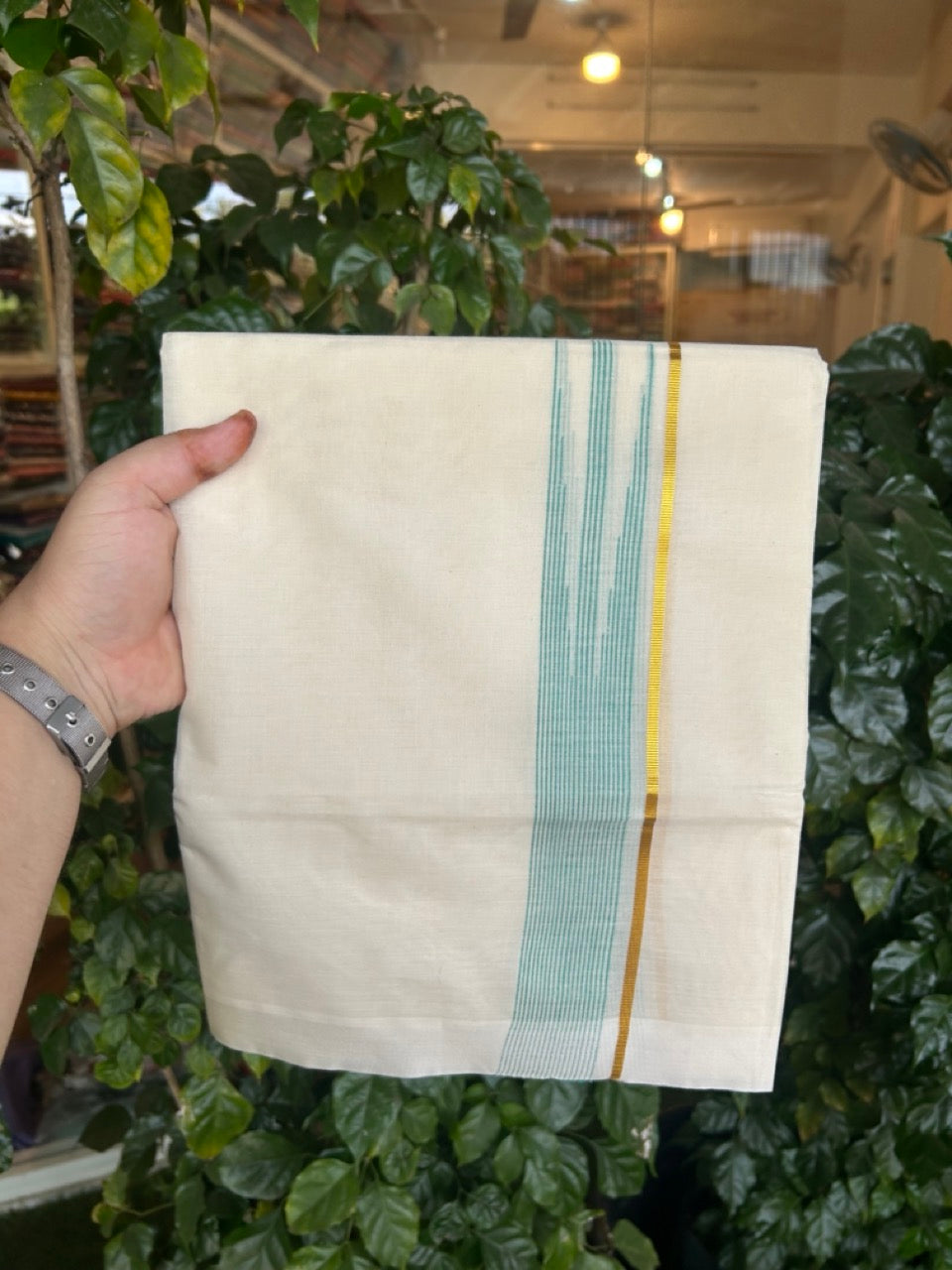 20% Discount ! Kaitharikada Balaramapuram 100% Pure Cotton Double Off white (Unbleached) Mundu/Dhoti - 100x80 - 1.5 inch Gold Kasav & Turqouise Shaded Stripes Chutty Kara - 19 KK5283 PMC