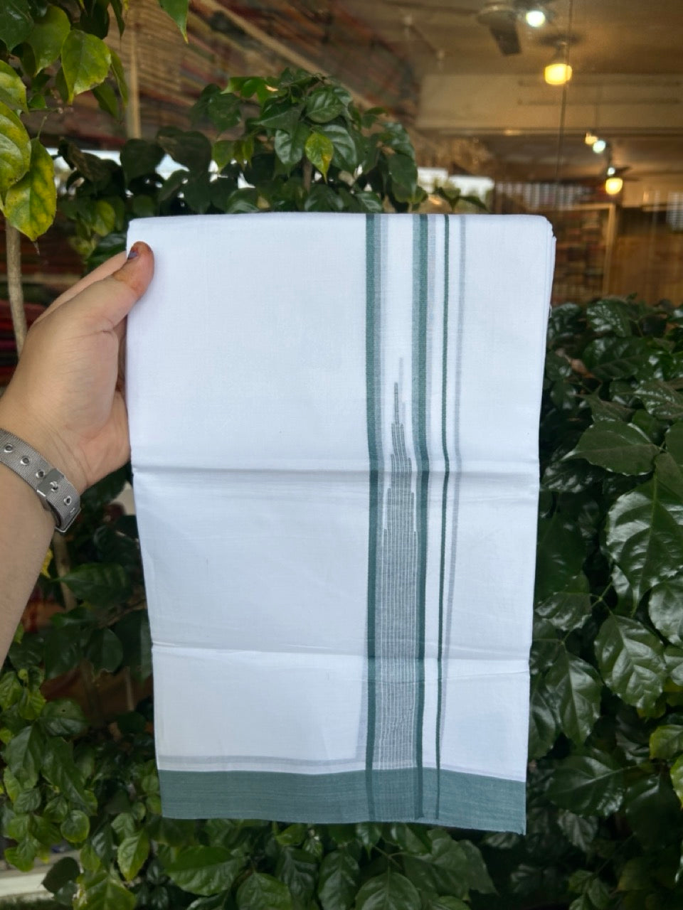 20% Discount ! Kaitharikada Balaramapuram 100% Pure Cotton Double Pure White Mundu/Dhoti - 100x80 - 1.25 inch Teal Green striped temple chutty 3.90 mtr (8.5 muzham) - 53 KK5287 PMC