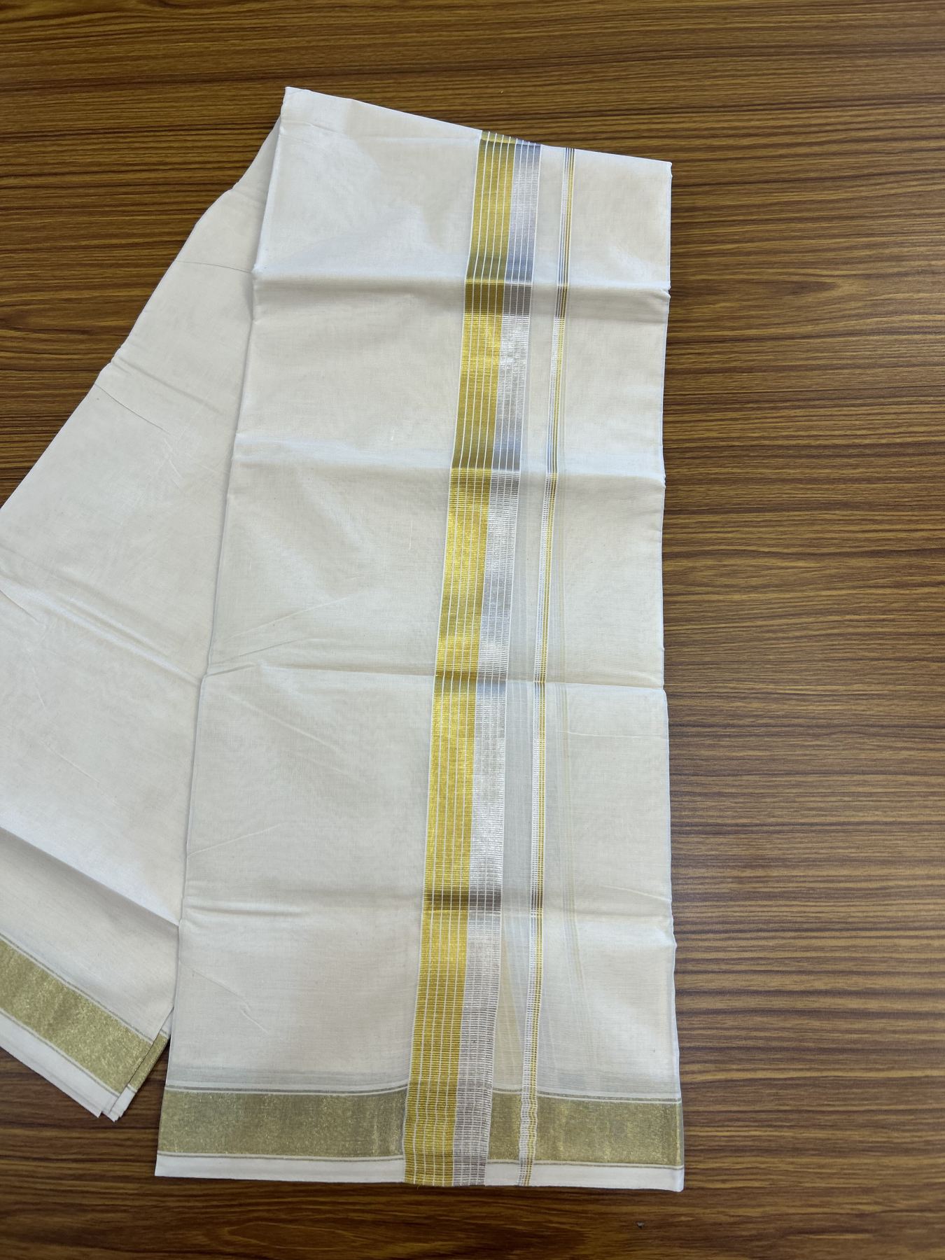 20% Discount ! KaithariKada Balaramapuram - 100% Pure Cotton Off White - (Unbleached) Double Mundu/Dhoti - 100X80 - 1.5 inch Gold Kasav & Silver Kasav Striped Kara 4 mtr (8.5 muzham) - 12 KK5340 VIN