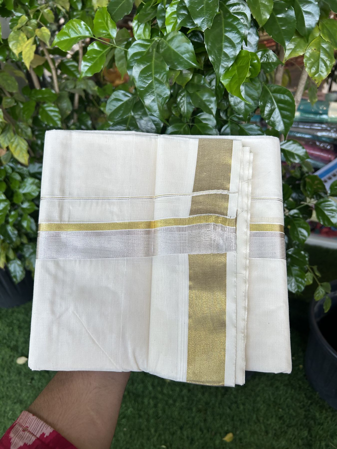 20% Discount ! KaithariKada Balaramapuram - 100% Pure Cotton Off White - (Unbleached) Double Mundu/Dhoti - 100X80 - 1.5 inch Gold Kasav & Silver Kasav Striped Kara 4 mtr (8.5 muzham) - 15 KK5340 VIN