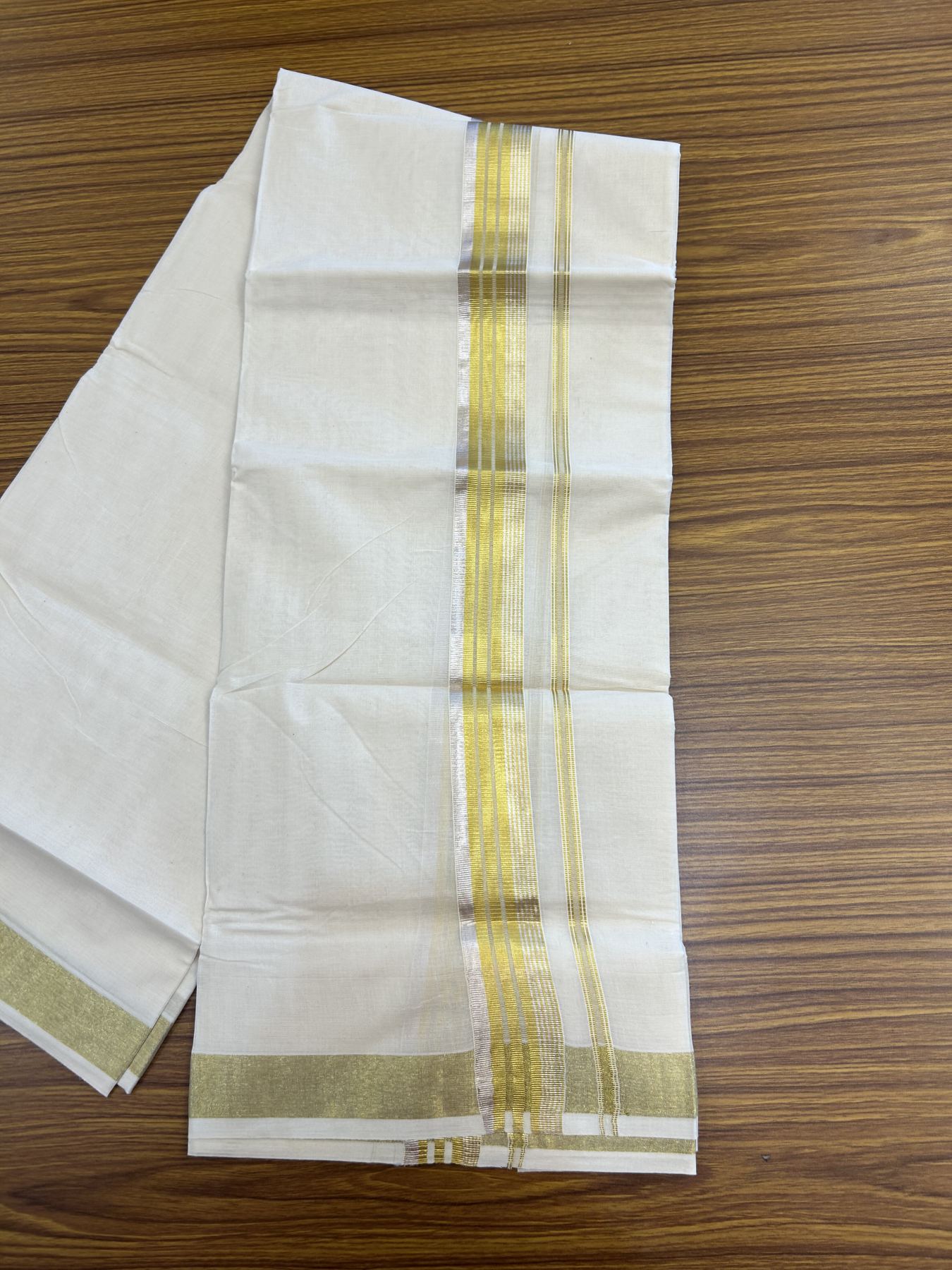 20% Discount ! KaithariKada Balaramapuram - 100% Pure Cotton Off White - (Unbleached) Double Mundu/Dhoti - 100X80 - 1.5 inch Gold Kasav & Silver Kasav Striped Kara 4 mtr (8.5 muzham) - 23 KK5340 VIN