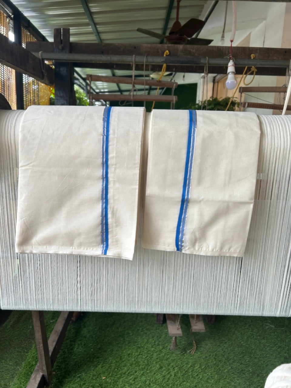 20% Discount!! KaithariKada Balaramapuram - 100% PURE Cotton Off White (Unbleached) Mundu/Dhoti & Neriyath set - 1.5 cm Silver Kasavu & Blue Design Kara - 15KK5238 ASH
