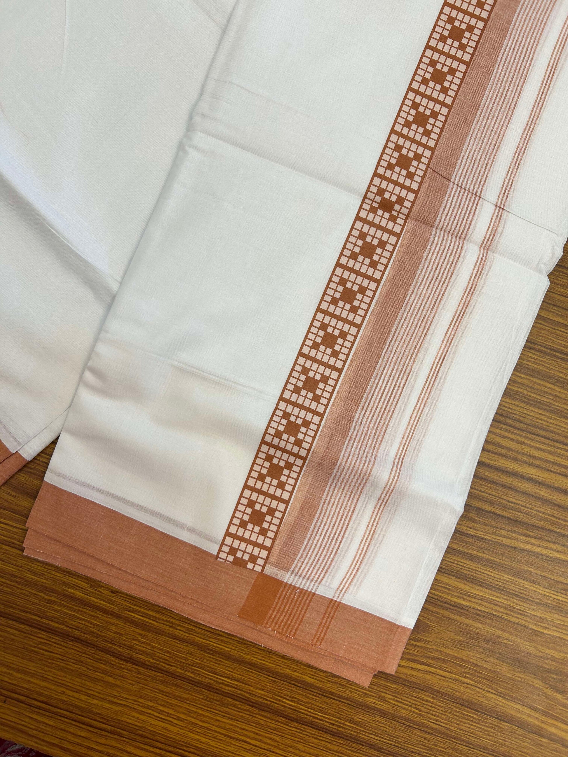 20% Discount ! KaithariKada Balaramapuram Cotton Double Pure white Mundu/Dhoti- 60s - 2.5 inch Brown Printed Shaded Stripes Design Kara - 3.65 mtr (8 muzham) - 36 KK5309 GAN