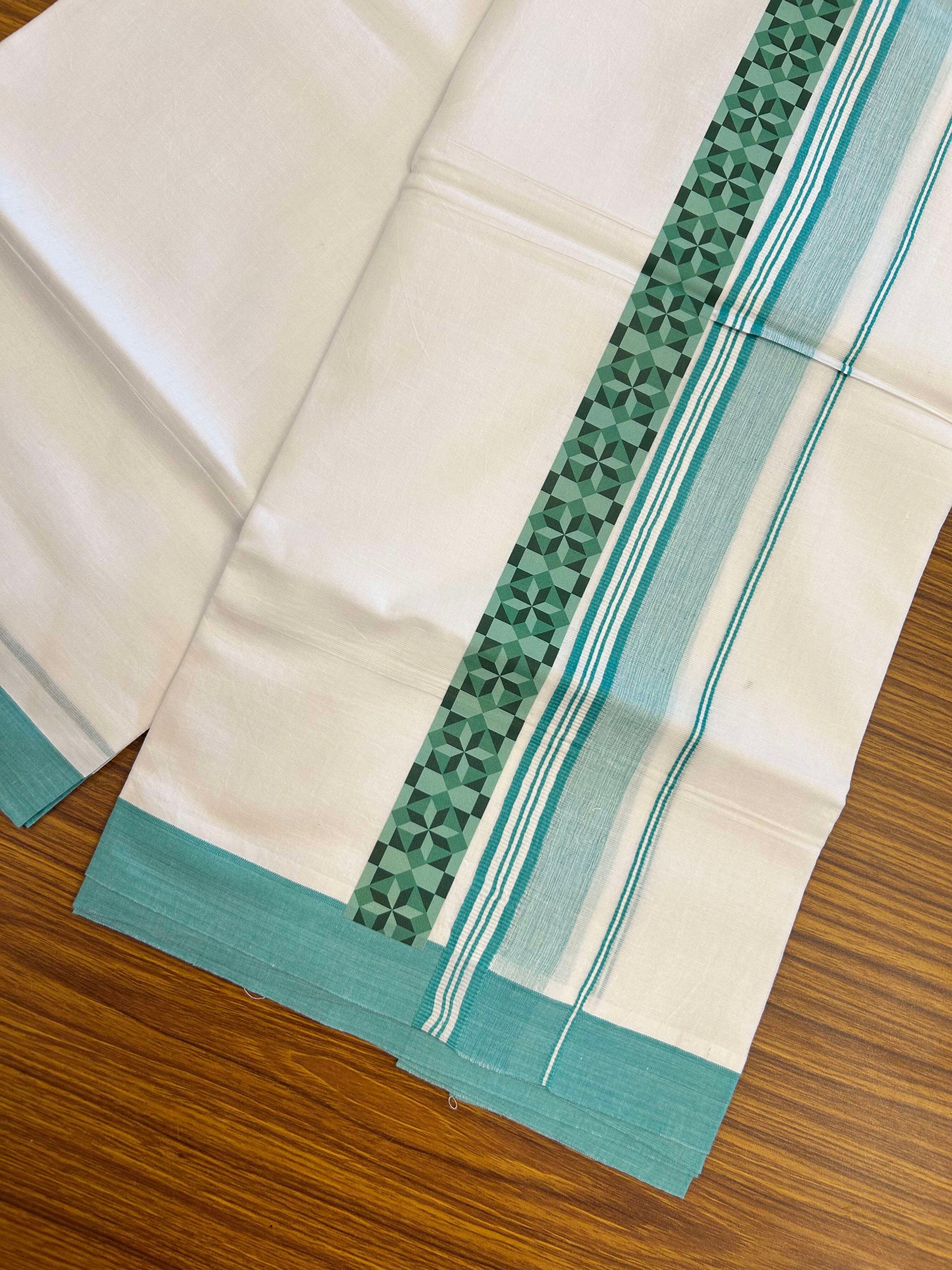 20% Discount ! KaithariKada Balaramapuram Cotton Double Pure white Mundu/Dhoti- 60s - 2.5 inch Turquoise Green & Dark Green Printed Shaded Stripes Design Kara - 3.65 mtr (8 muzham) - 31 KK5309 GAN
