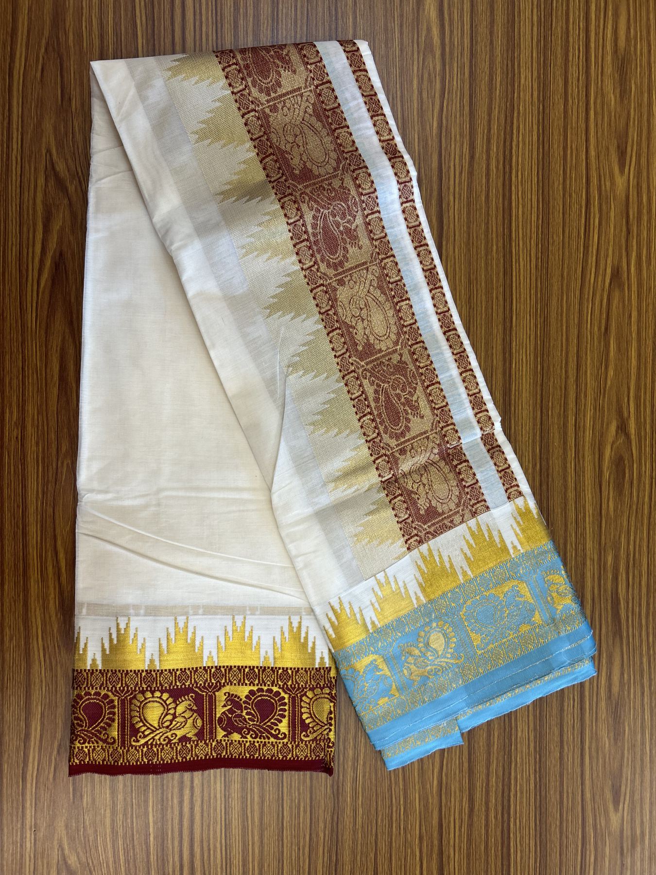 Panchakacham Dhoti - 20% Discount! Kaitharikada Balaramapuram Cotton Mix - Off White - (Unbleached) 80X90 thread - North Iindian - Attached Gamcha - 9x5 Dhoti - 5.25 inch Gold Kasav Light Blue & Maroon Heavy Design kara - 14 KK8305 PMC
