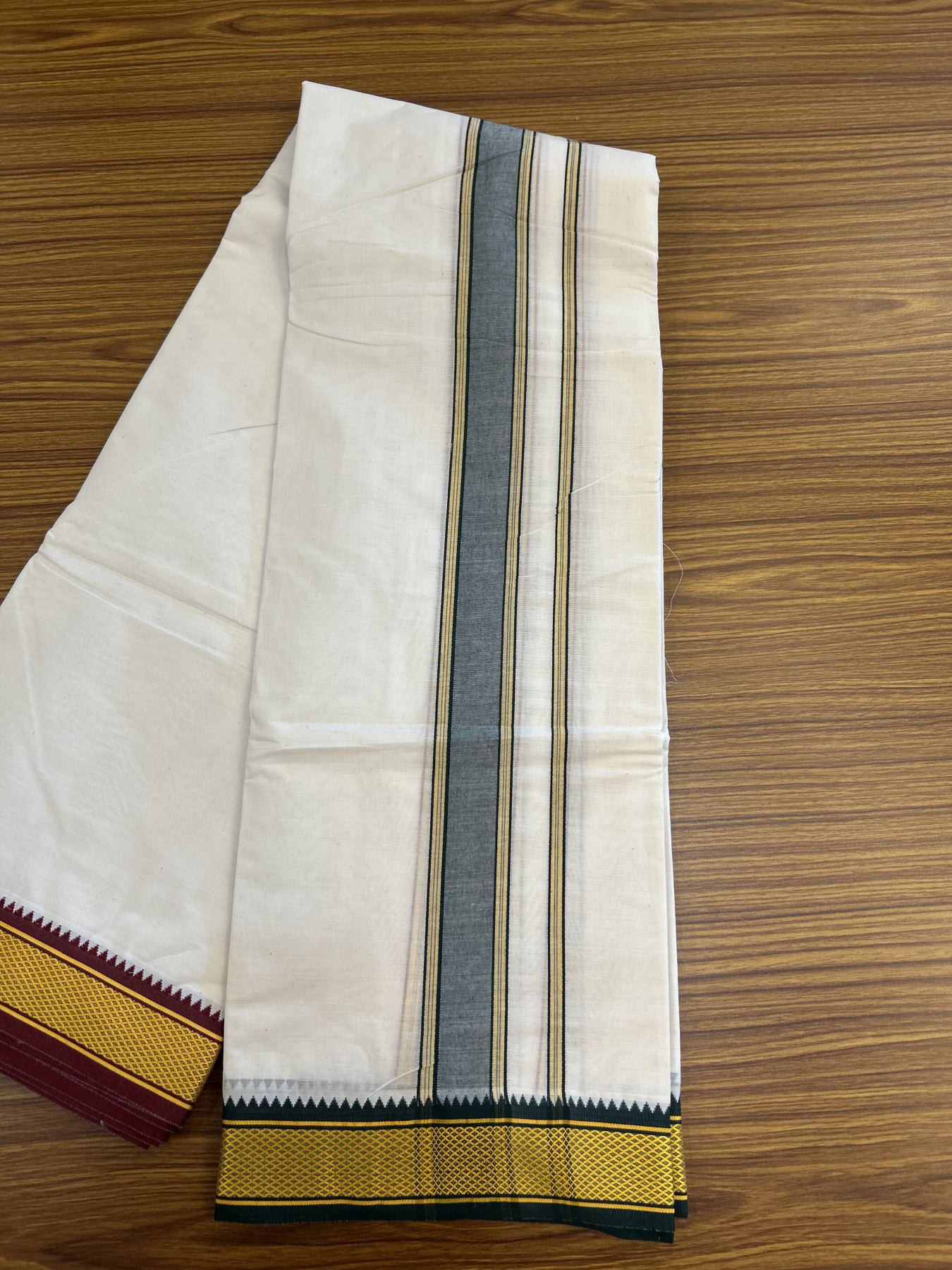 Panchakacham Dhoti - 20% Discount! Kaitharikada Balaramapuram Cotton Mix - Off White - (Unbleached) 80X90 thread - North Iindian- Attached Gamcha - 9x5 Dhoti - 1.75 inch Yellow & Green shaded kara - 36 KK8305 PMC