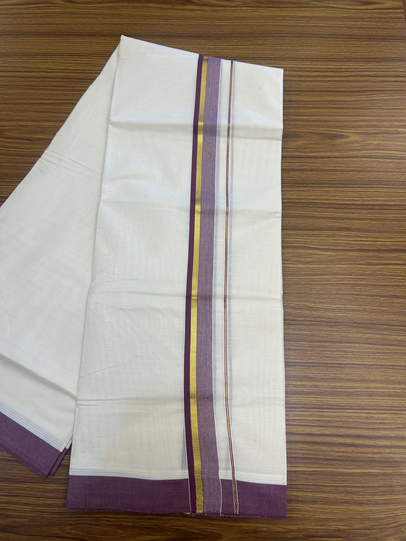 20% Discount! Kaitharikada Balaramapuram Double Off White Mundu/Dhoti - 80s - 1.25 Inch Gold Kasav & Grape Purple Stripes Kara 4 mtr (8.5 muzham) - 2 KK5311 VAS