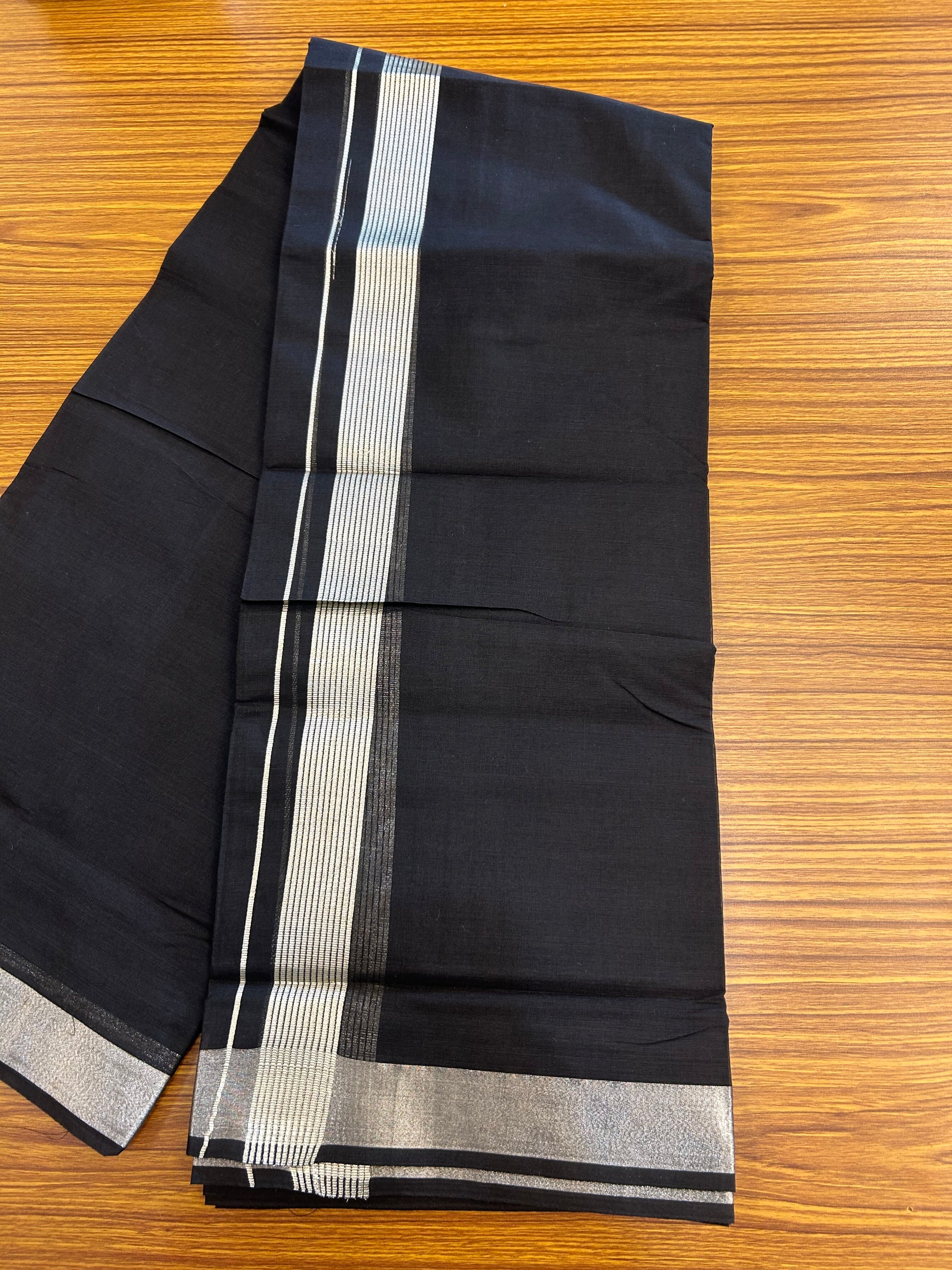 20% Discount !! KaithariKada Balaramapuram Double (Unbleached) Mundu/Dhoti - 80X90 - Black Colour Body - 1.5 inch Silver Kasav Kara 4 mtr (8.5 muzham) - 1 KK5343 PMC