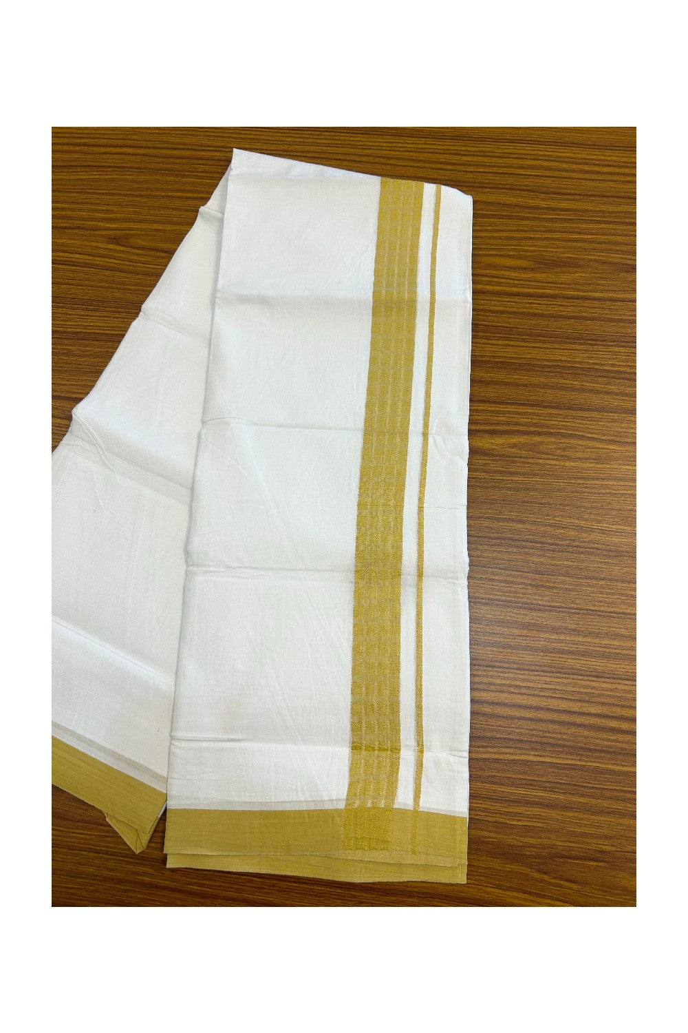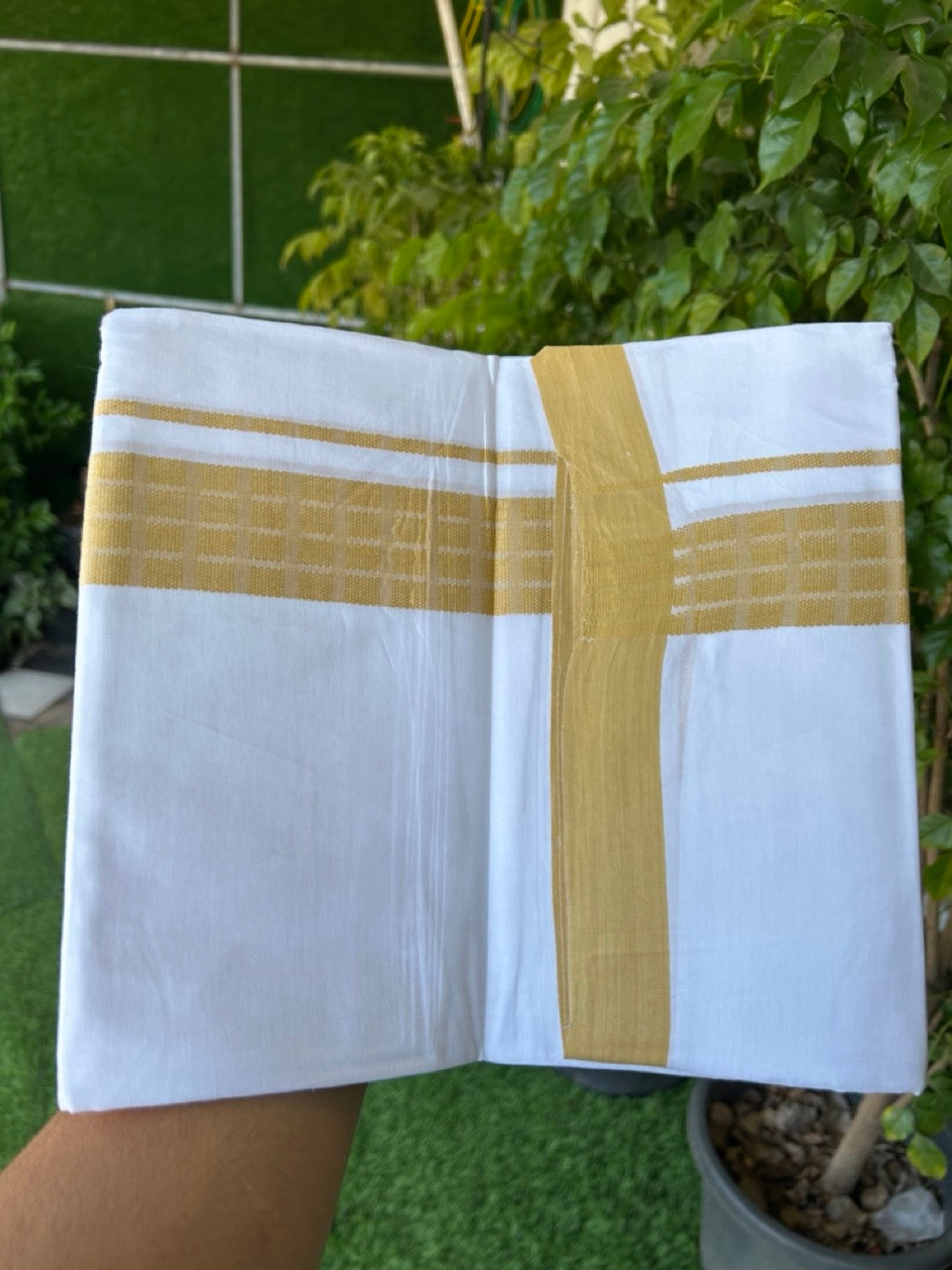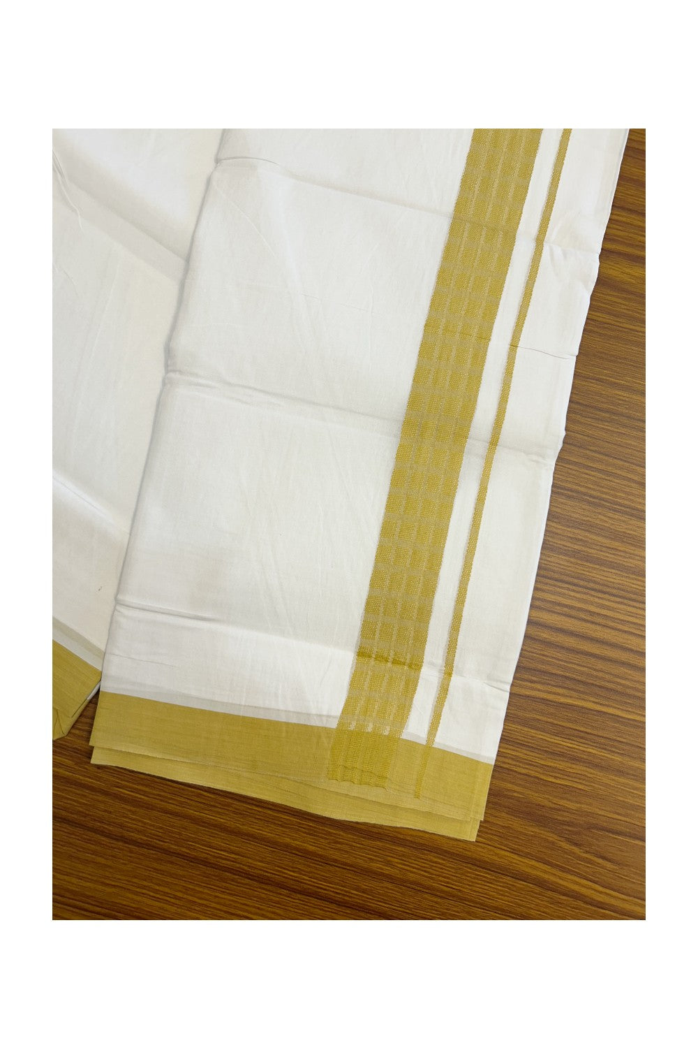 20% DISCOUNT! KaithariKada Balaramapuram Double PURE WHITE 100% Cotton Mundu/Dhoti - 100x80 - 2 inch Jacquard Mustard Yellow Check Kara - 35KK5139THI