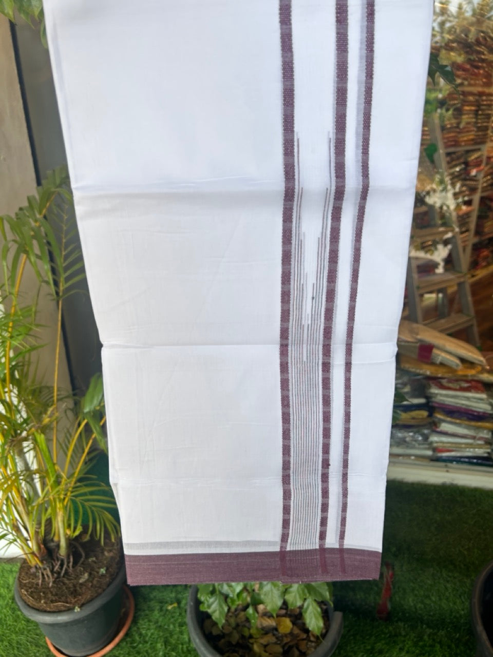 20% Discount! KaithariKada Balaramapuram Double Pure White 100% Cotton Mundu/Dhoti - 100x80 - 1.5 inch Wine Purple Putta Design Chutty Kara - 16KK5174THI