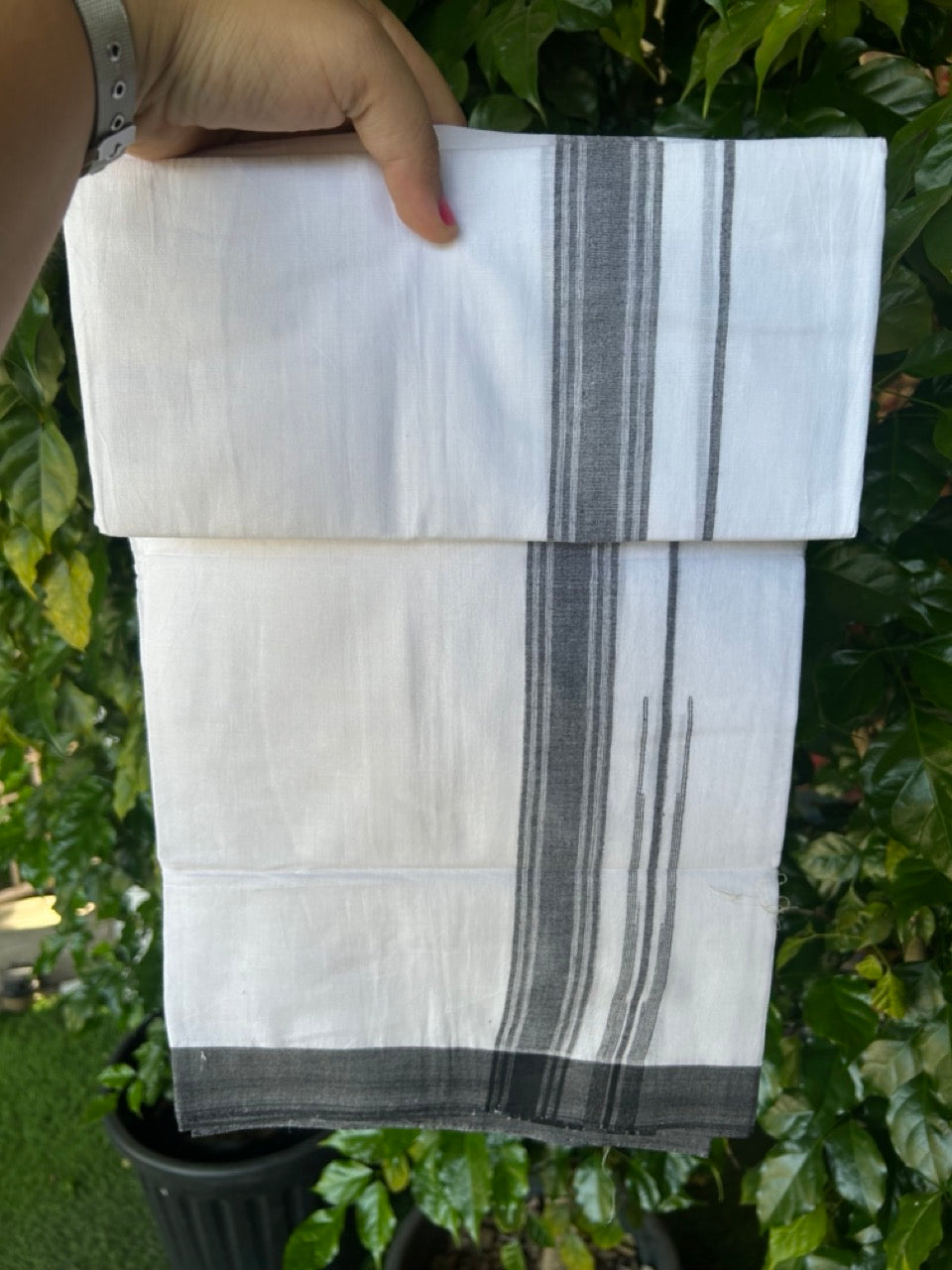 20% Discount!!! KaithariKada Balaramapuram Double PURE WHITE Mundu/Dhoti - (80s) - 1.25 inch puliyilakkara Black Shaded Striped chutty Kara - 3.82 mtr ( 8 muzham)- 8KK5239 GAN