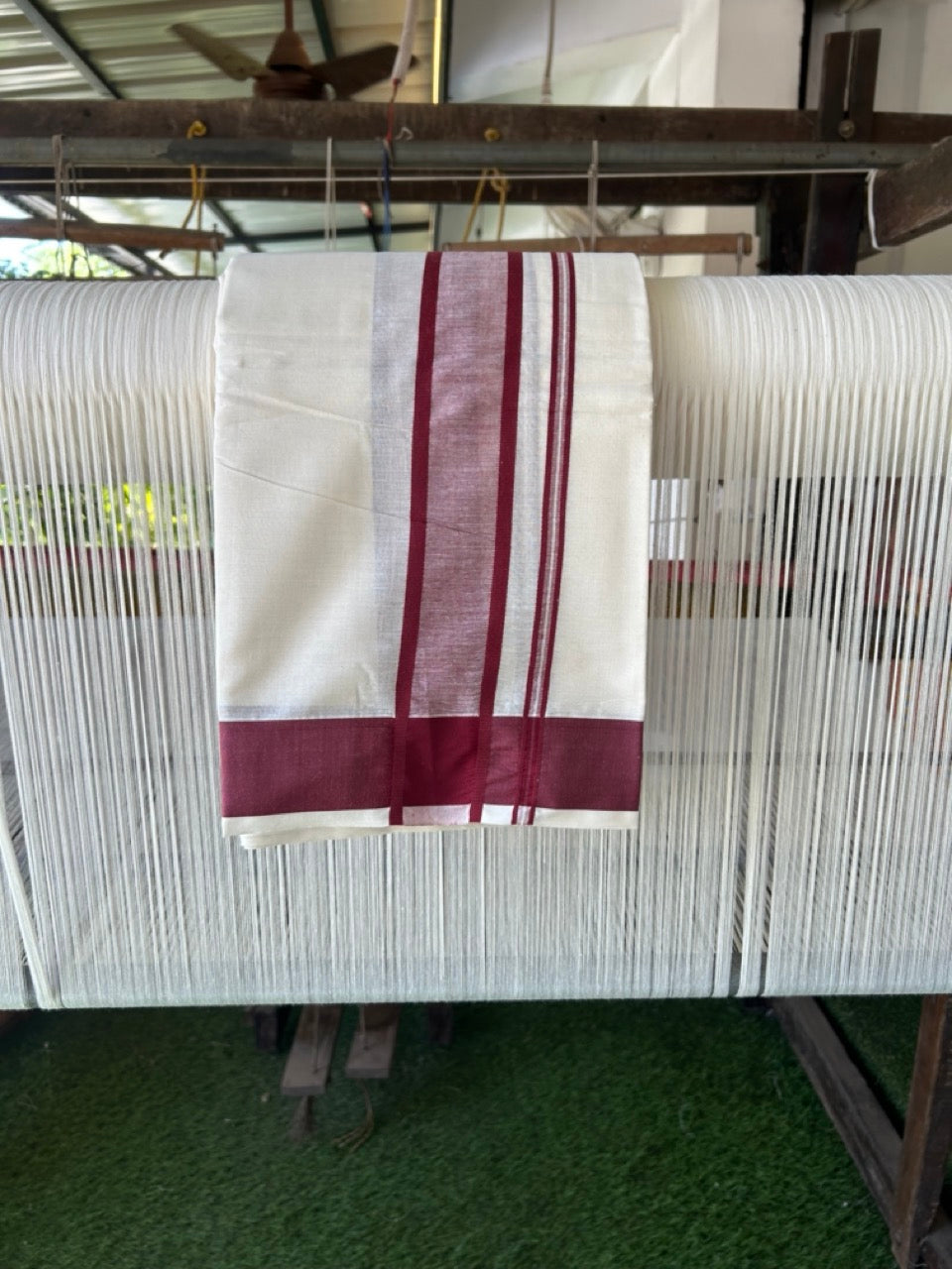 20% Discount! Kaitharikada Mixed Cotton Off White (Unbleached) - 80x90 - North Indian Attached Gamcha - 10x6 - Maroon Shaded border - 24 KK8304 PMC