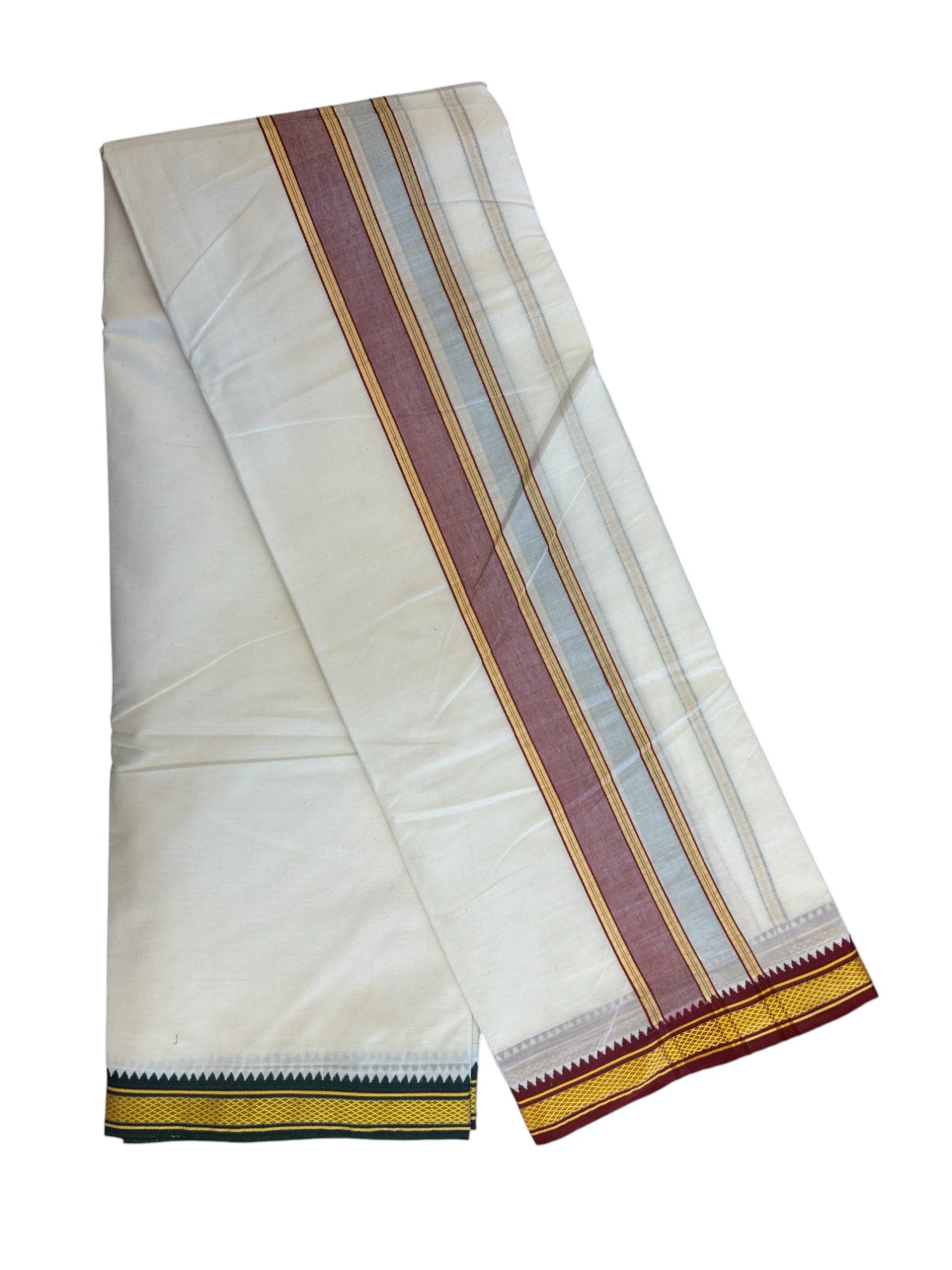 20% DISCOUNT! KaithariKada OFF WHITE (Unbleached) - Cotton Mix -80x90 thread - 80 % Cotton & 20% Polyester- NORTH INDIAN - ATTACHED GAMCHA 9X5 Dhoti - 2 inch Green & Maroon kara with Yellow border - 104KK5227 PMC