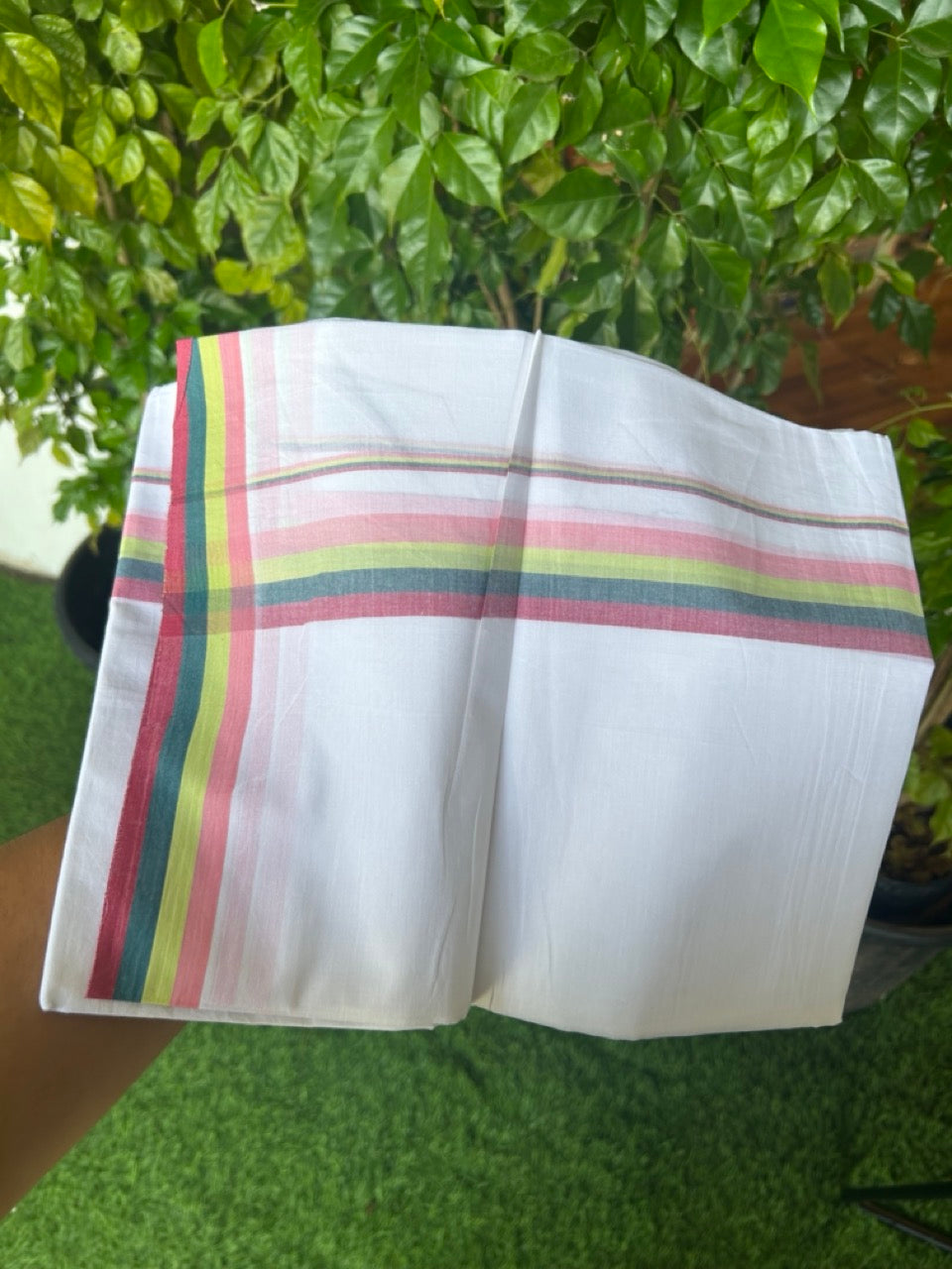 21% DISCOUNT ! KaithariKada Balaramapuram 100% Cotton Pure white Double Mundu/Dhoti - 100X90 - 1.25 inch Multi Colour kara - 2KK5202PMC