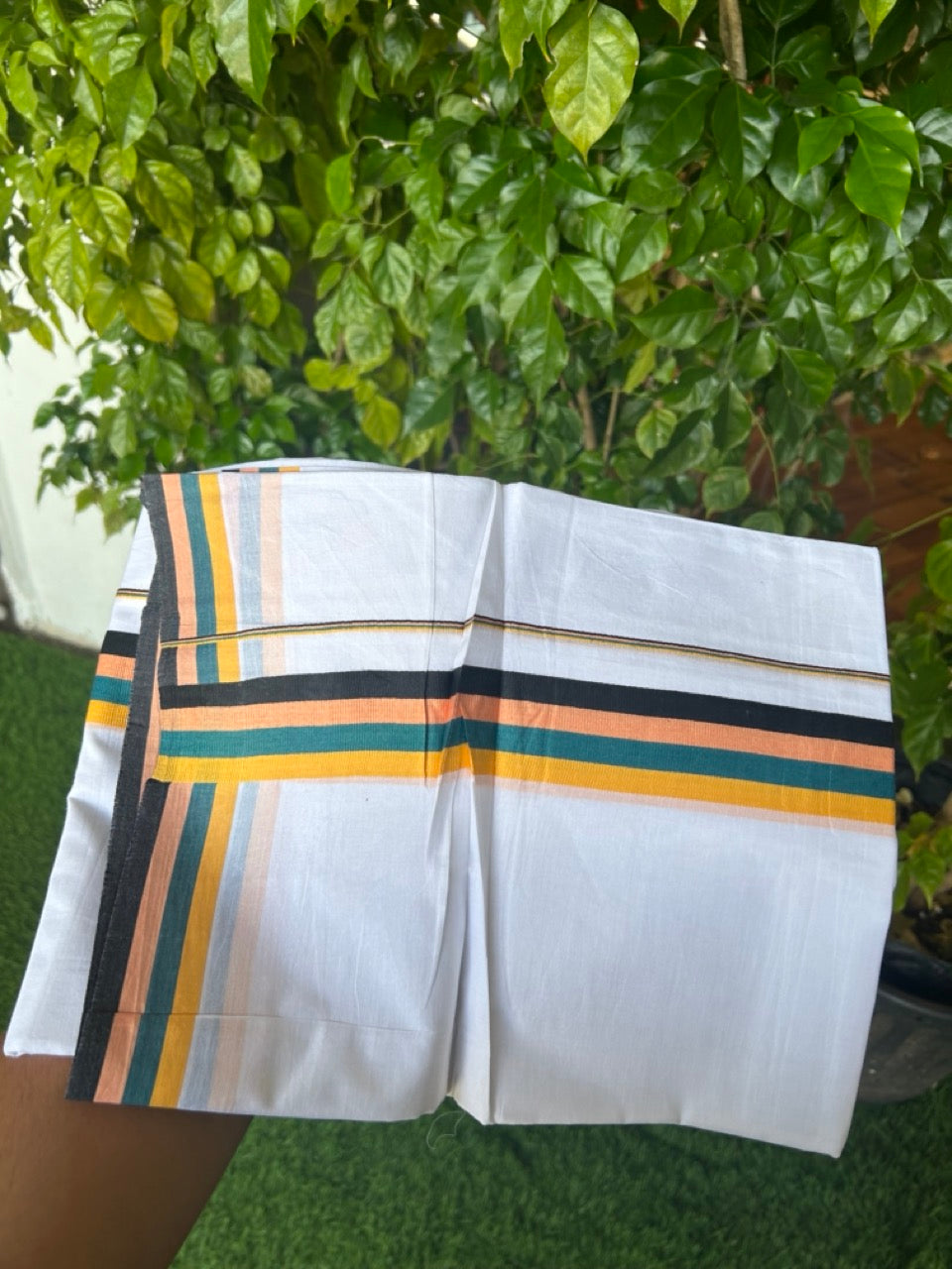 21% DISCOUNT ! KaithariKada Balaramapuram 100% Cotton Pure white Double Mundu/Dhoti - 100X90 - 1.5 inch Multi Colour kara - 5KK5202PMC