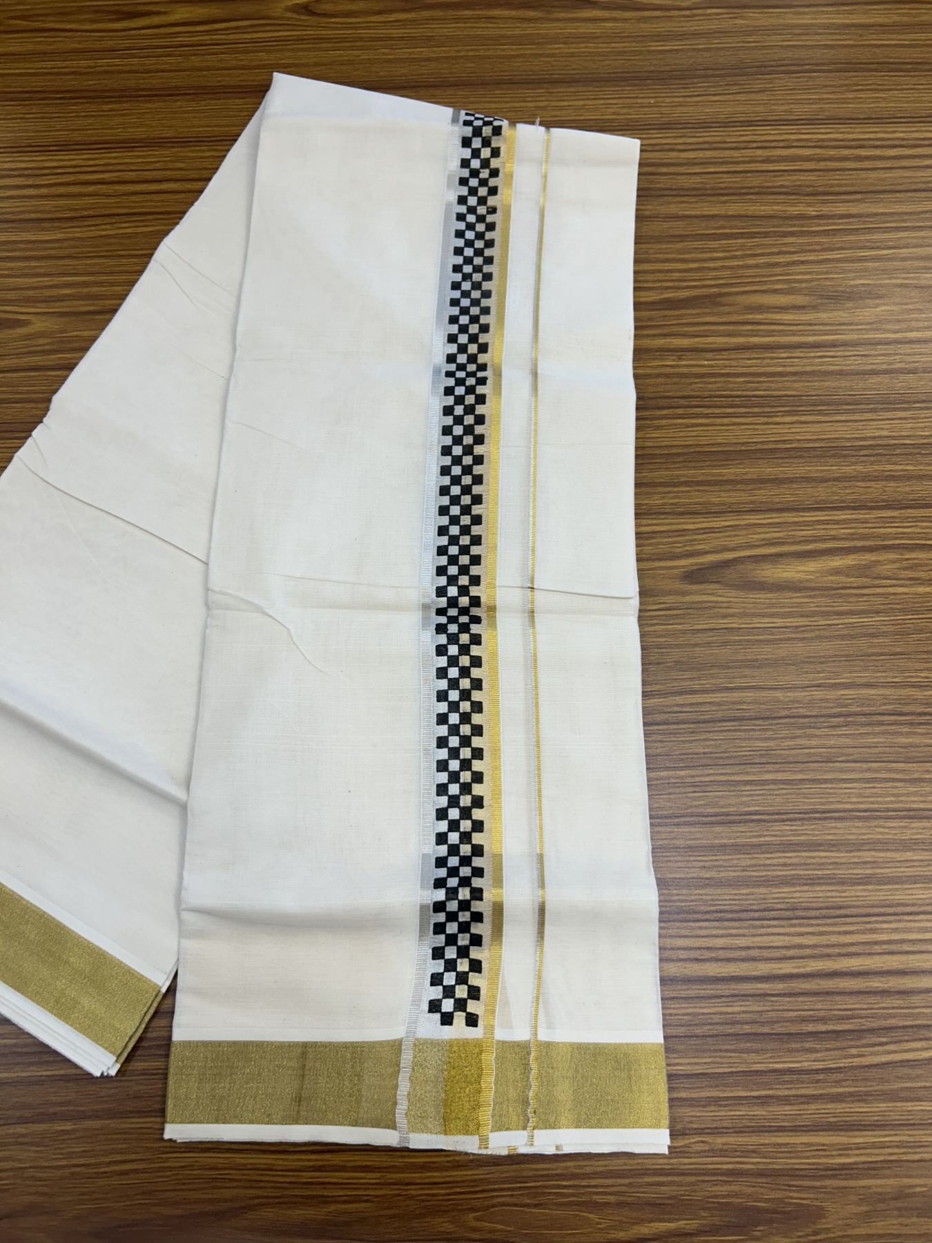 22% Discount!! KaithariKada Balaramapuram 100% Cotton Double Off White - (Ubleached) Mundu/Dhoti - 80x80 - 1.5 inch Silver & Gold Kasav Black Printed Design Kara - 4 mtr (8 muzham)- 34 KK5318 GAN