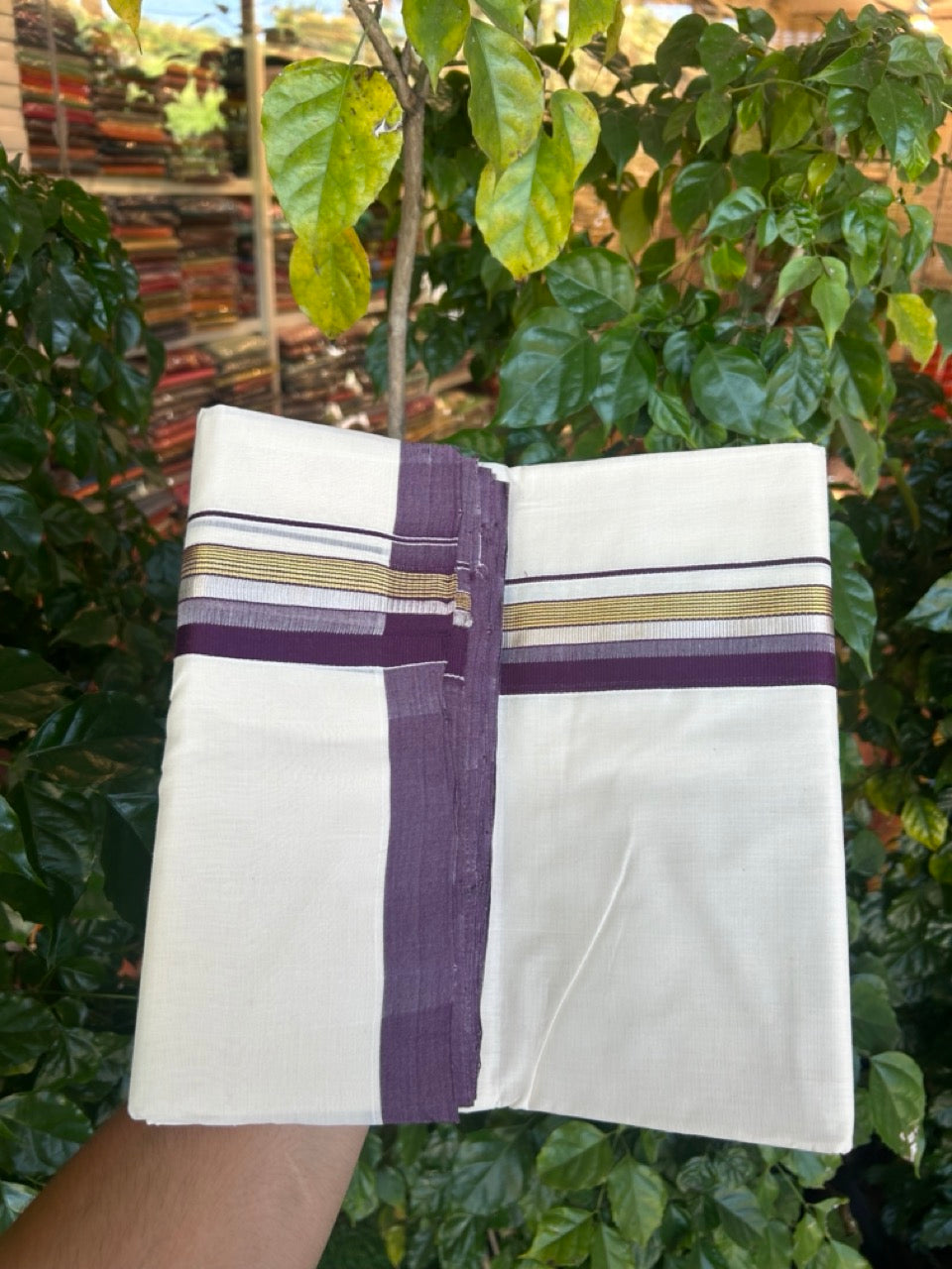 25% Discount!! KaithariKada Handloom Millpaav Balaramapuram - 100% Pure Cotton Off White Double - (Unbleached) Mundu/Dothi -80x90 - 1.5 Inch Silver Kasav & Gold Kasav Wine Purple Stripes kara 4mtr (8.5 muzham) - 10 KK5264 RAM