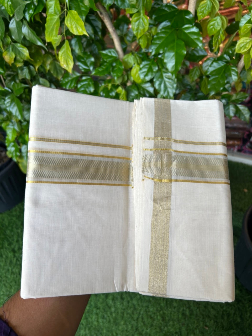 25% Discount ! KaithariKada HANDLOOM UNAKKUPAAV Balaramapuram - 100% PURE Cotton Off White - (Unbleached) Double Mundu/Dhoti - 80X90 - 1.5 inch Gold Kasavu & Silver Kasavu Jacquard Kara 4 mtr (8.5 muzham) - 50 KK5234 RAM
